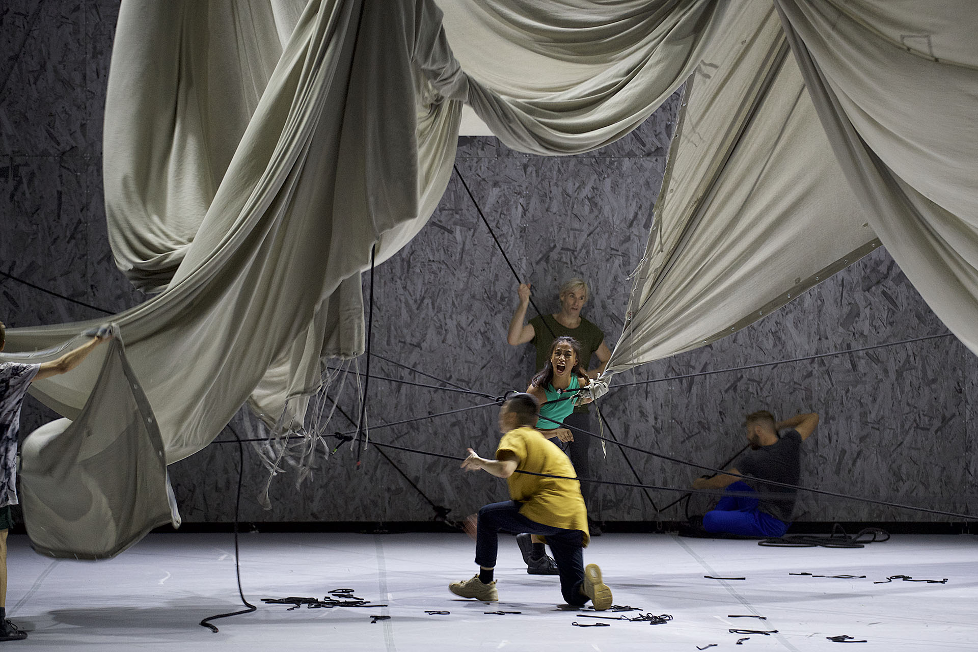 Zentrales Element ist der Vorhang, vor dem das Stück mit sieben TänzerInnen beginnt. Nachdem der Vorhang herunter gefahren und von den nun zehn TänzerInnen abgenommen wurde, wird dieser zum Objekt der Veränderung. Ausgehend von einen Stoffhaufen erarbeiten die TänzerInnen in gemeinschaftlichen Aktionen bizarre Stoffobjekte, welche den gesamten Bühnenraum einnehmen und fortwährend von den Akteuren in Schwerstarbeit und in schneller Folge verwandelt werden. Selbst in den hinteren Reihen ist die enorme Anspannung auf der Bühne zu spüren. Slow Motion findet hier nicht statt. Zum Schluss wird