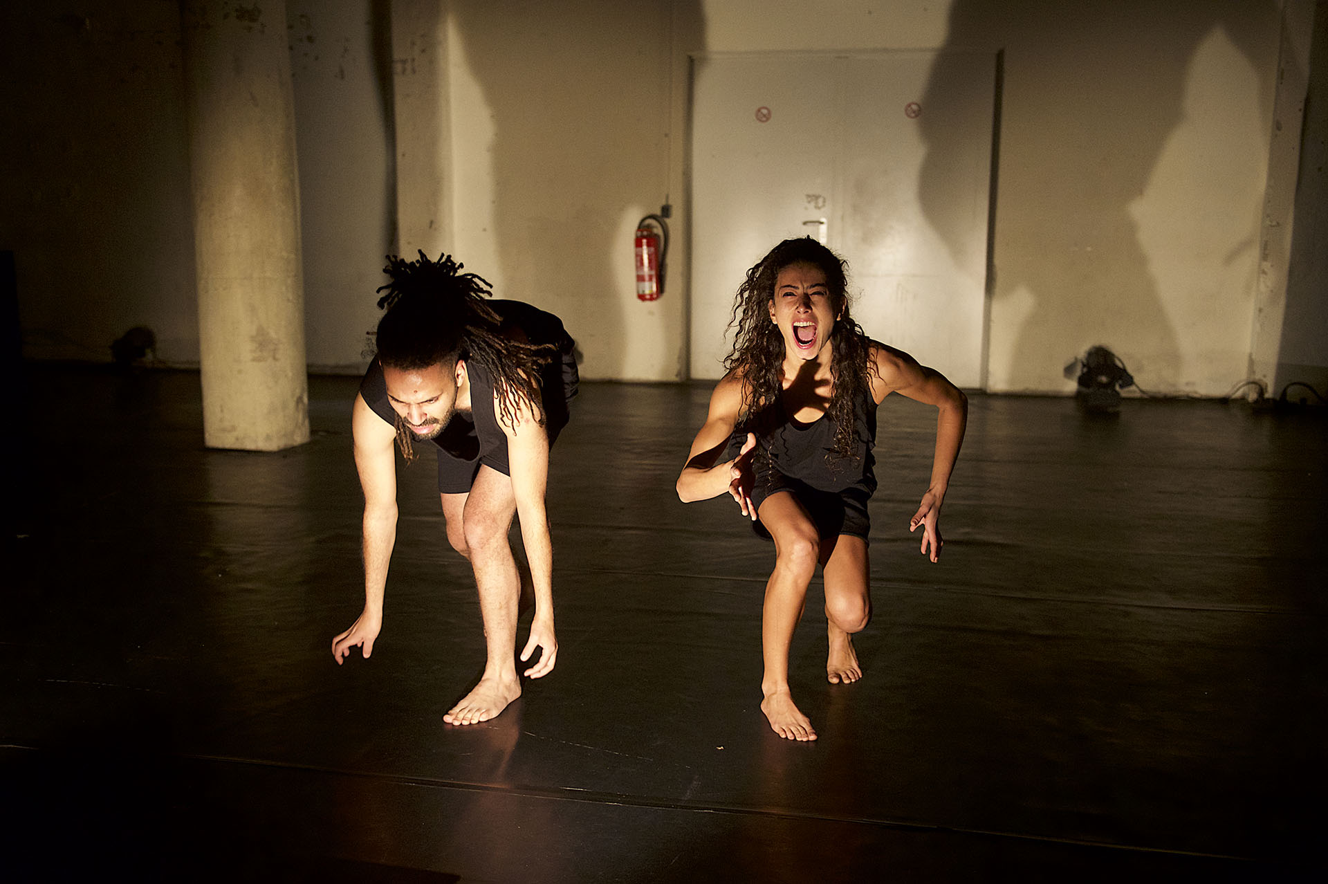 Die Kantine ist die kleinste Bühne der Sophiensaele. Ein extremes Rechteck, heute eine breite Bühne mit geringer Tiefe und Säulen im Bühnenraum. Platz für das Duo „walking ...“ von Shaymaa Shoukry für die Tänzerin Shaymaa Shoukry und den Tänzer Aly Khamees. Ein Spiel mit Bewegung, Licht und extremen, fast nicht fotografierbaren Schatten. Das zweite Stück des Abends ist das Solo „(I - them)“ von Nagham Salah Othman für den Tänzer Ezzat Ismaiel Ezzat. Ein intensives Männersolo. Hautnah. Zusammen mit der Musik ist jede Muskelanspannung direkt spürbar. Wunderbar.