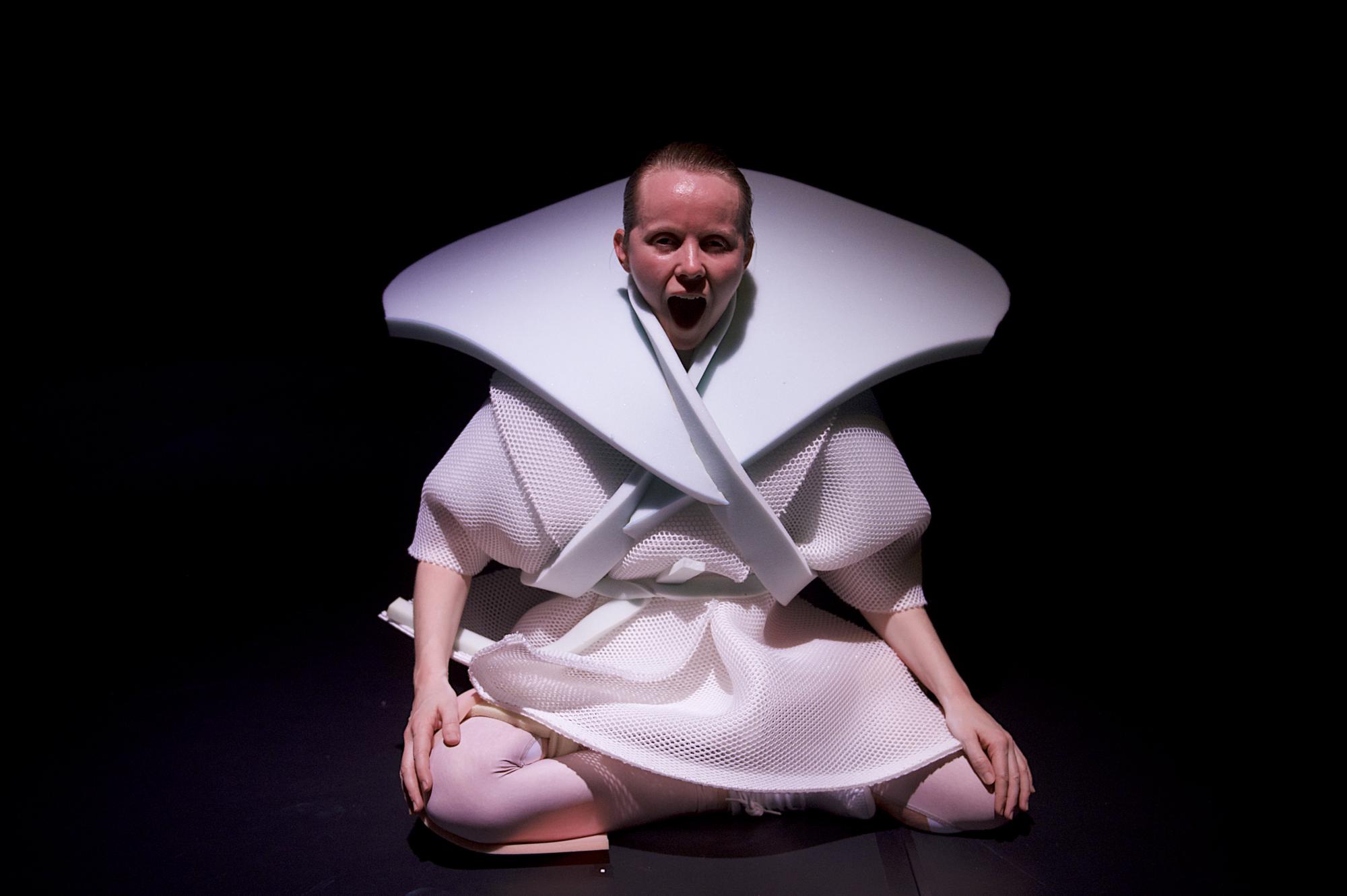 Anne-Mareike Hess hatte ich schon als Tänzerin 'vor der Linse', nun also mit einer eigenen Choreografie „Warrior“, welche nun ihre deutsche Uraufführung feiert. Eine fast leere Bühne mit einigen farbigen 'Skulpturen' auf der rechten Seite der Bühne. In der Mitte hängt ein Mikrophon von der