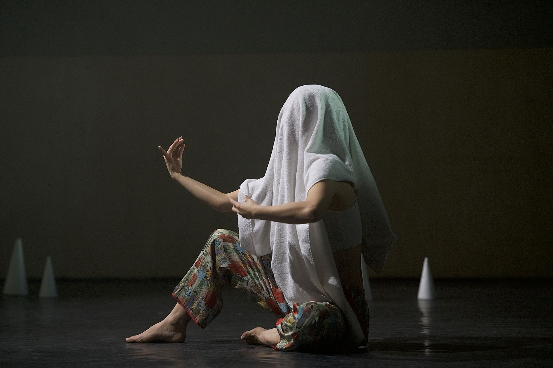 Es ist immer wieder spannend welchen großen Bogen eine Tanzperformance haben kann. Olivia Hyunsin Kim beginnt ihre neue Arbeit „Yellow Banana“ unbekleidet, um dann mit dem Saunatuch frischen Wind in den Theaterraum zu wedeln. Mit dem Mikrofon geht es weiter. Schließlich tritt sie als Popsängerin auf und dann erscheinen vier MusikerInnen mit ihren Trommeln. Zum Glück wurden mir vor der Performance Ohrstöpsel angeboten. Es ist kaum zu glauben, wie laut Trommeln sein können. Mit dem Sound und Tanz der Trommeln, in traditionellen Kleidern, den wirbelnden Bändern am Kopfschmuck wird das Stück