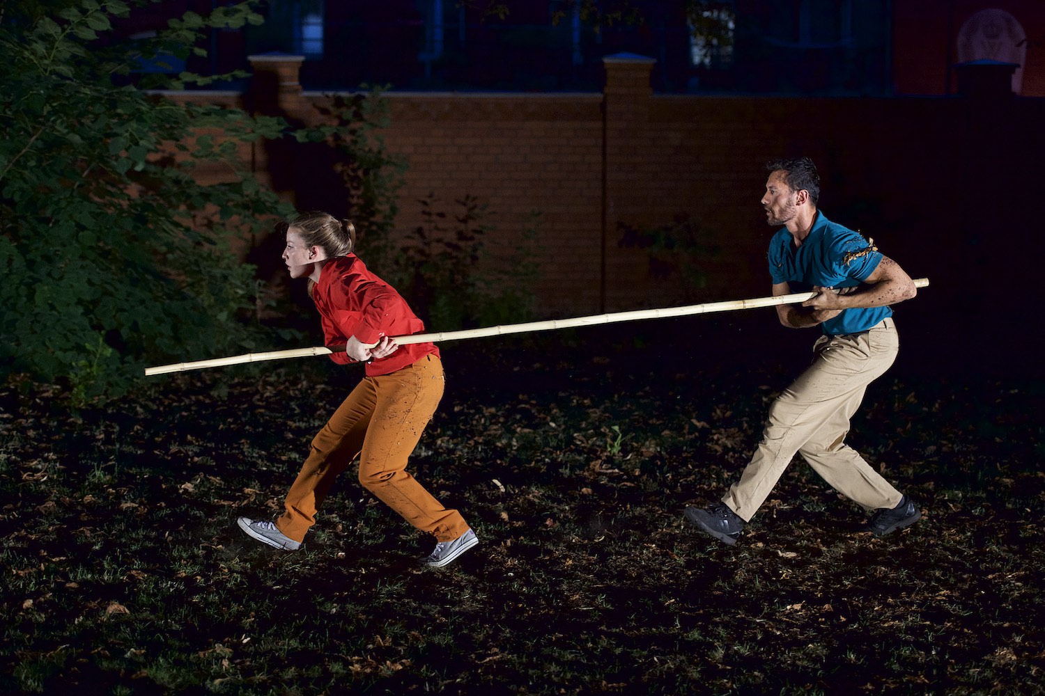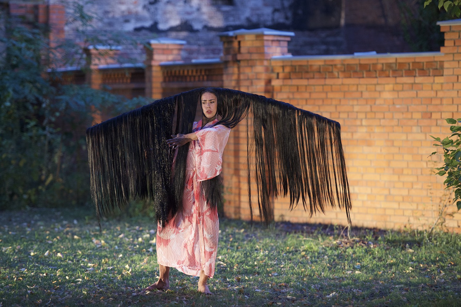 Bei „meantime“ von Toula Limnaios in der Halle TanzBühne Berlin erkunden Performende und Publikum magische Gärten und die ehemalige Turnhalle mit Podesten, Stockwerken und Feuertreppen.