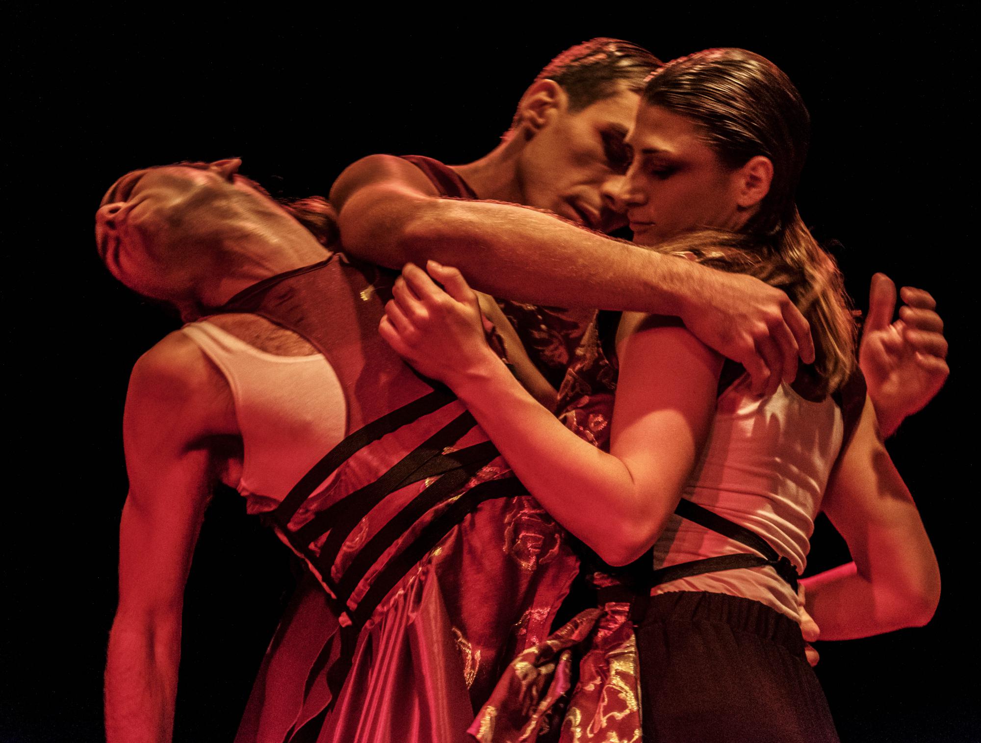 Es ist ein wenig wie bei beliebten Buch- und Filmreihen: Der erste Teil ist der beste, und den Sequels gelingt es nicht, an ihren Vorgänger, an den Startpunkt, heranzukommen. So auch in Stephan Herwigs neuer Produktion „The Lovers“, deren viel versprechende Anfangssequenz den inoffiziellen Höhepunkt des Abends ausmacht. Zu Beginn ist der Bühnenraum für eine Weile, vielleicht sogar wenige Minuten, vollständig abgedunkelt. Ganz langsam schleichend beginnen zwei Scheinwerfer in der Mitte drei Schemen, die ineinander verschlungen auf einem quadratischen Teppich positioniert sind, mattrot