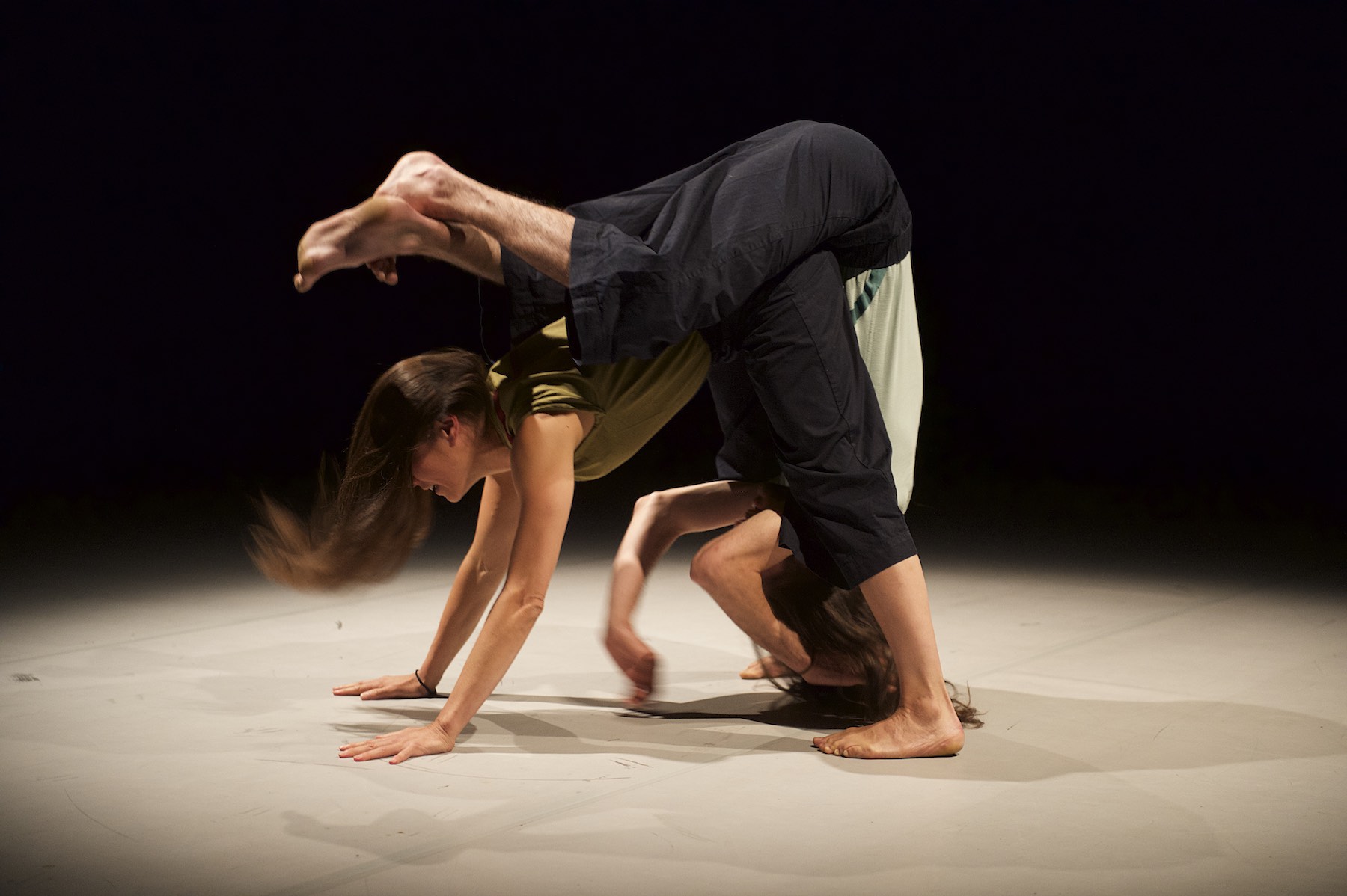 Ein kleiner Lichtfleck in der Mitte der kreisrunden Arena im Uferstudio 14. Aus der Dunkelheit kommt schemenhaft ein vielbeiniges Wesen. Das vielbeinige Wesen sind eng verschlungen Rebecca Weingartner und Benjamin Lindh Medin. So beginnt die Choreografie „EQUALITY!“, mit der das diesjährige internationale Tanzfestival für junges Publikum PURPLE eröffnet wird. Zwischen den beiden entwickeln sich sportliche, akrobatische Spiele, Verfolgungsjagden, Dialoge und und und. Ein unheimlicher Spaß, in meinem Fall mit dem Fotoapparat, die beiden in ihren Aktionen zu verfolgen. Bei diesem Stück in