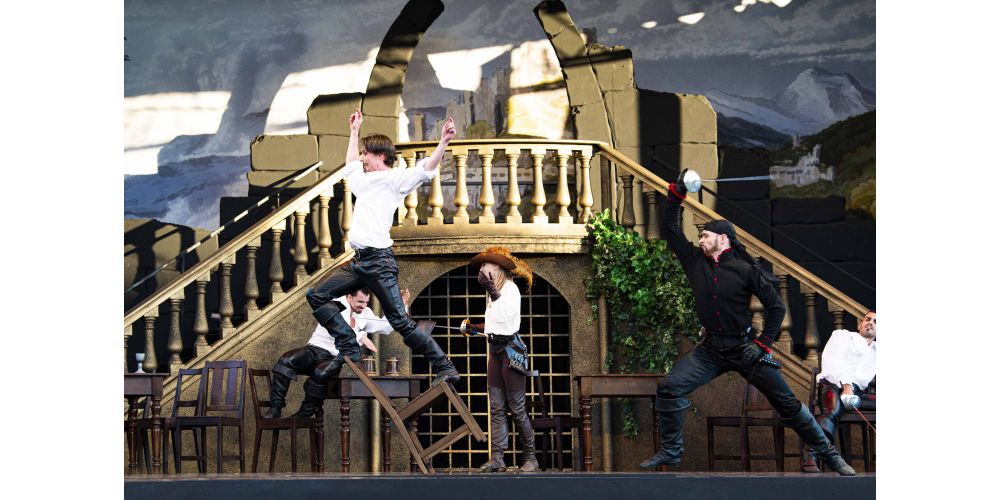 Als der Vorhang fällt, sieht man einen von zwei geländergezierten Treppen flankierten Kerker, über dem sich wahlweise der Palast des Kardinals Richelieu oder die Kaserne der Musketiere befindet. Ein Proklamateur verliest den jeweiligen Ort, weil Umbauten in Open-Air-Produktionen kaum möglich sind. Was dann in flotter Inszenierung abläuft, nimmt es mit der literarischen Vorlage nicht allzu genau, kassiert all die tödlichen Intrigen und ringt ihr harmlos vergnügliche Momente ab. Denn der unerschrockene D’Artagnan ist hier ein vorwärtsdrängendes junges Mädchen, das Mitglied der Garde werden möchte, zunächst jedoch abgelehnt wird. Traurig muss es zusehen, wie die Musketierte ihre Gewehre präsentieren, mit ihnen jonglieren, Fechtduelle trainieren.