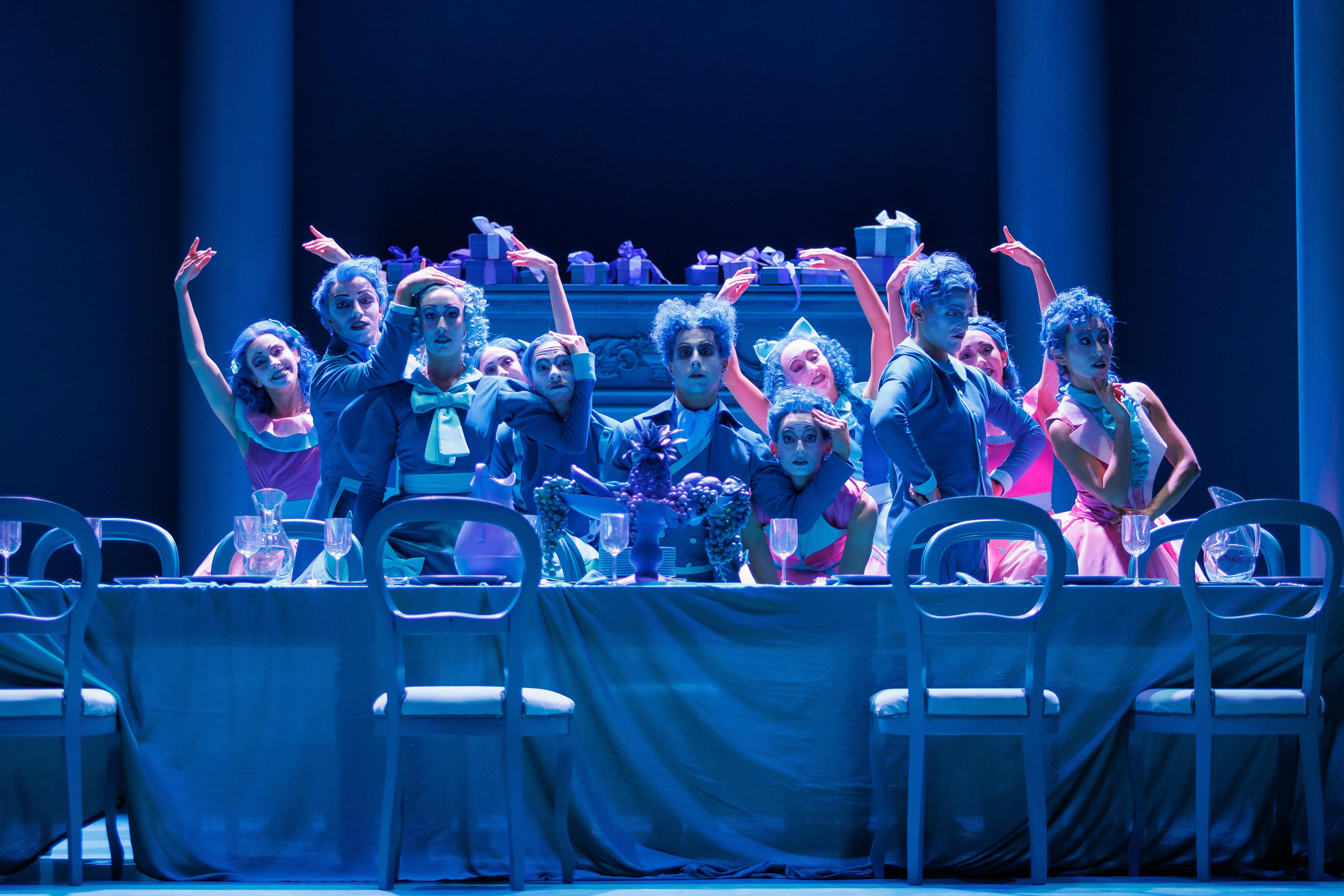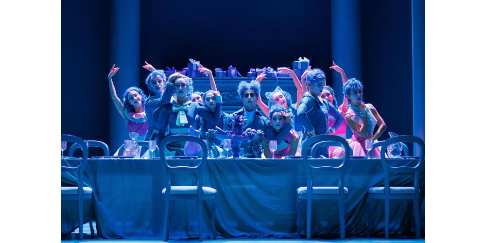 Nichts jedoch geschieht in dieser Inszenierung bierernst, hehr oder klassisch. Giorgio Madia fügt das pralle Geschehen mit so leichter Hand, mit so viel Augenzwinkern, reichert es mit derart vielen Gags und alltäglichen Beobachtungen an, dass gerade jungen Zuschauern der Einstieg schmerzfrei gelingen dürfte. Auf die Musik der Ouvertüre deckt man im Haus Stahlbaum geschäftig die Festtafel, lässt die Gläser funkeln, das Tischtuch bauschen, hechtet Fritz akrobatisch über den Tisch. Im Nebel wallt Drosselmeyer zu den Gästen, alle gemeinsam tafeln rhythmisch grotesk zum Nussknacker-Marsch. Nach Verabschiedung der Gäste kuscheln die Stahlbaums kurz, klappst er ihr lüstern auf den Po. Der Kampf zwischen Soldaten und Mäusen wird nicht zum Nahgemetzel, sondern vollzieht sich stilisiert in der Distanz. Und die Schneeflocken, kostümlich nur durch Attribute gekennzeichnet, erinnern Clara an die eben aufgelöste Feiergesellschaft.