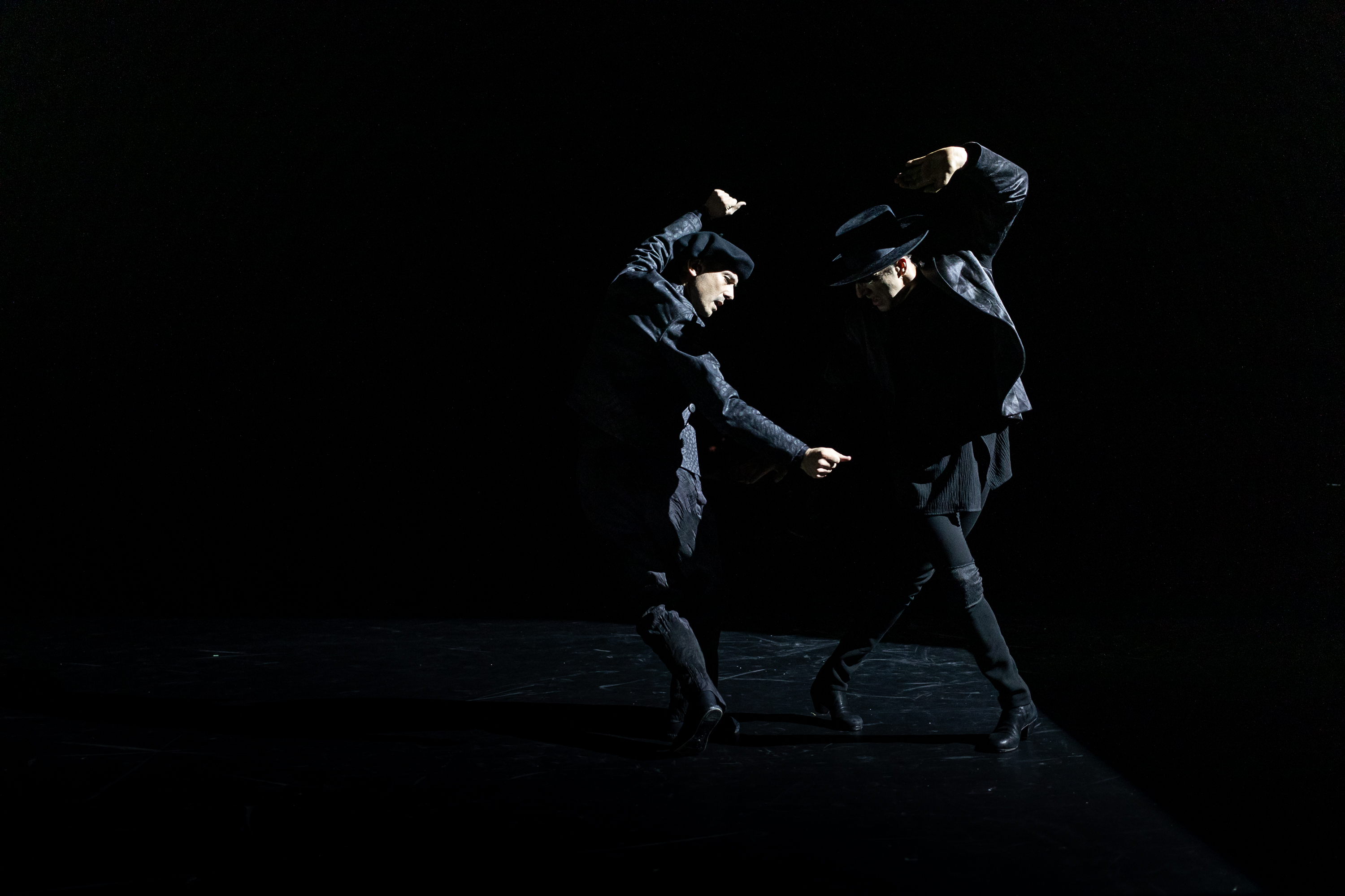 In „Yarin“ agieren die beiden Tänzer, Andrés Marín und Jon Maya, zusammen mit dem Musiker Julen Achiary auf der Bühne. Anfangs erkennt man alle drei immer nur kurz im Kegel eines langen Lichtstrahls, der aus unterschiedlichen Richtungen der Bühnendecke erscheint. Mal blitzt ein Hut, mal eine Baskenmütze auf. Mal erkennt man Beine, mal ein Profil. Im Hintergrund sind elektronische Klänge zu hören bis das Bühnenlicht angeht.
