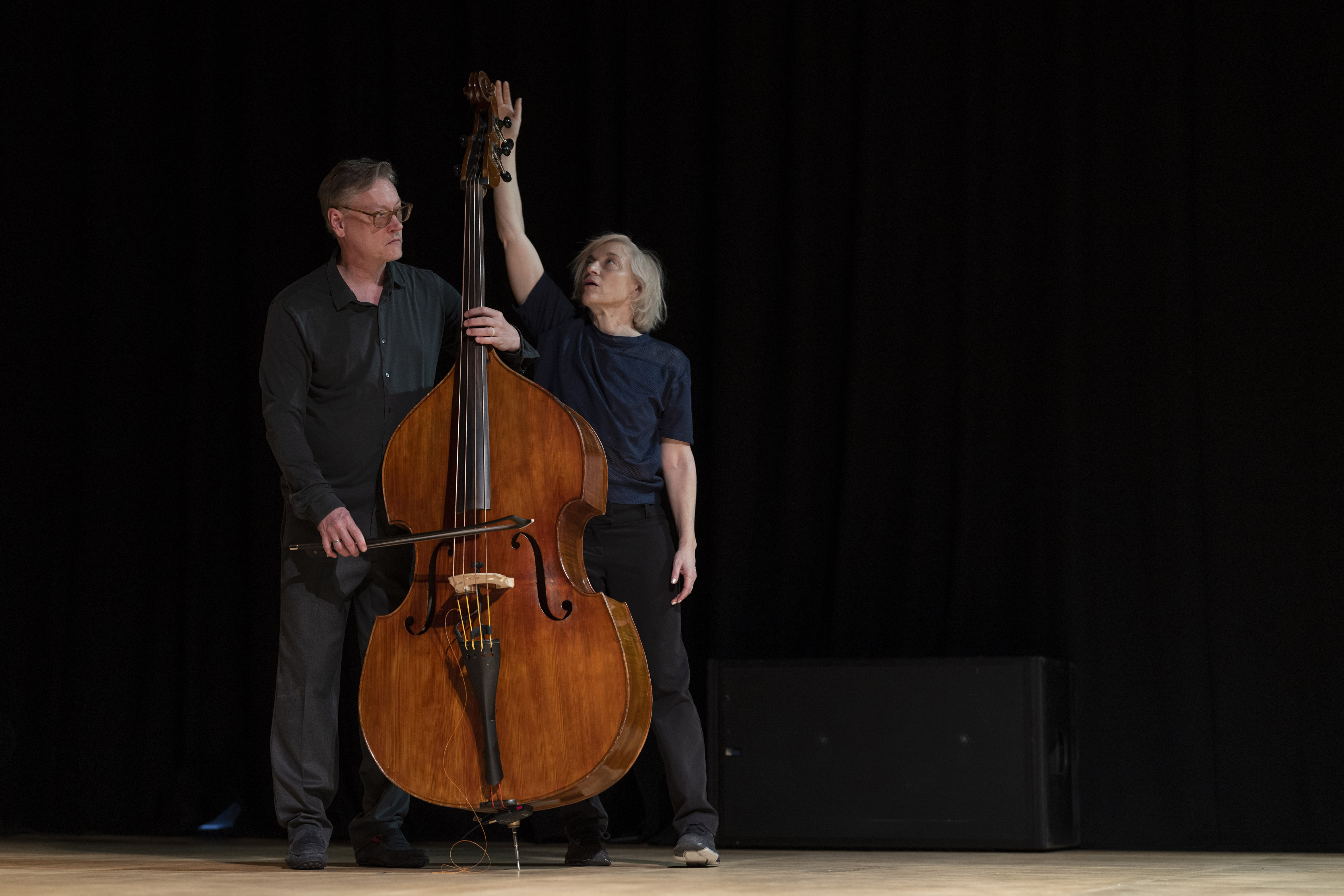Meg Stuart mit Doug Weiss (Kontrabass) und Mariana Carvalho (Klavier): „All The Way Around“