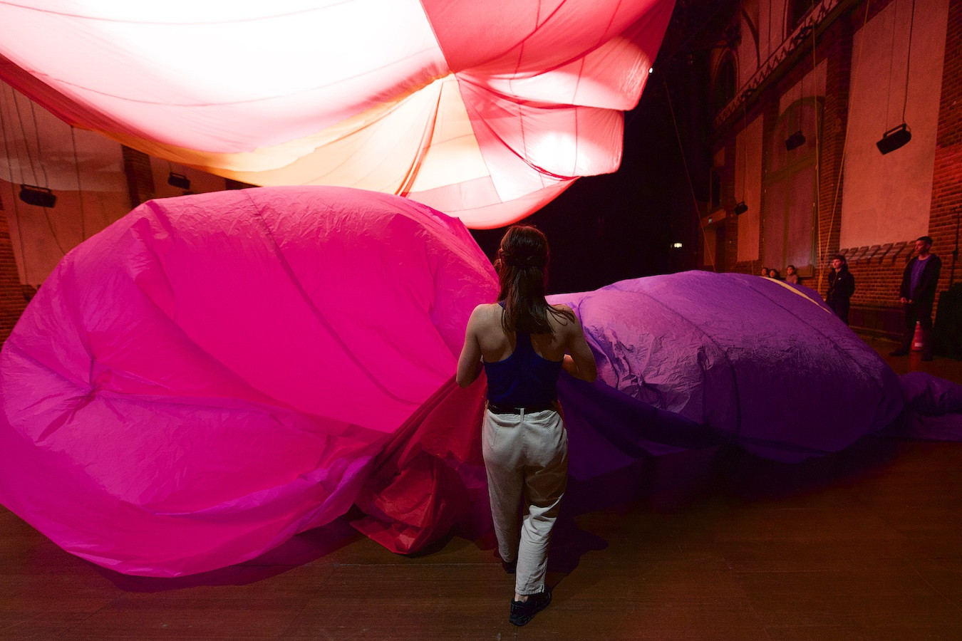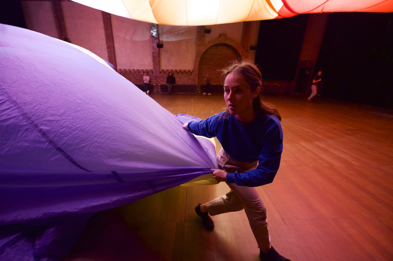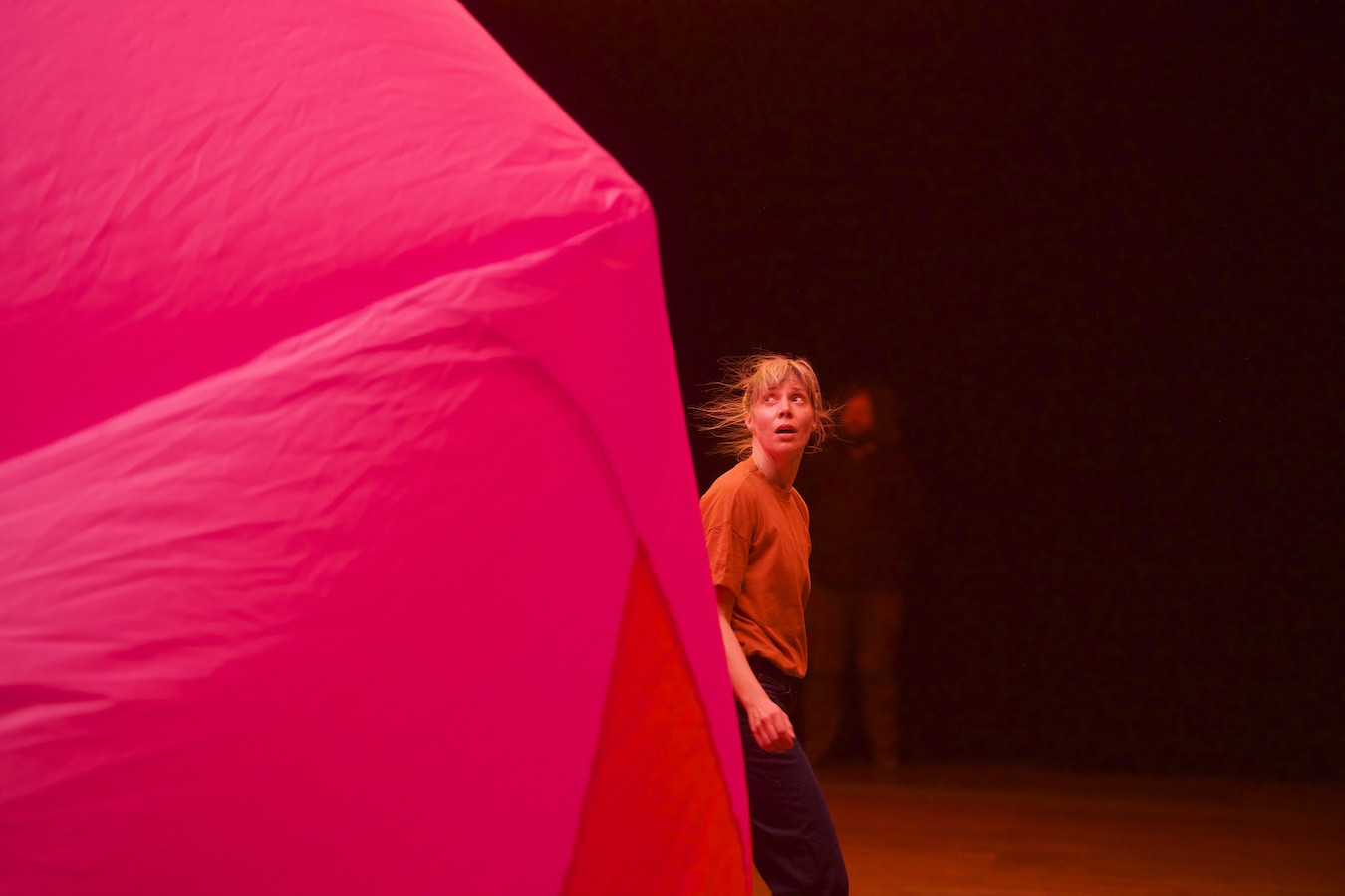 Die große Halle des Radialsystems V ist auf einmal ganz leer. Zwei überdimensionale Stoffobjekte (Sandra E. Blatterer) hängen vom Hallendach herunter, und ein großes Päckchen liegt am Rande der Bühne. Eine riesige Spielfläche für acht Tänzer*innen. Das „Zelt“ in der Mitte wird ein farbiger Leuchtkörper im Raumhimmel. Die beiden anderen Stoffobjekte werden mit Gebläsen aufgeblasen und entpuppen sich als weiche riesige „Kissen“. Bühne frei für den Tanz, einzeln, in der Gruppe, immer wieder in neuen Beziehungen. Zumindest bei der Generalprobe findet das Publikum seinen Platz