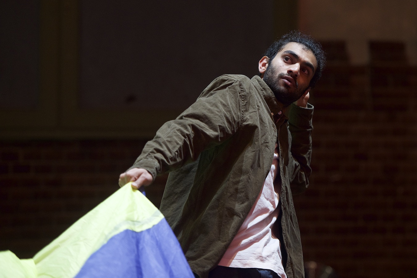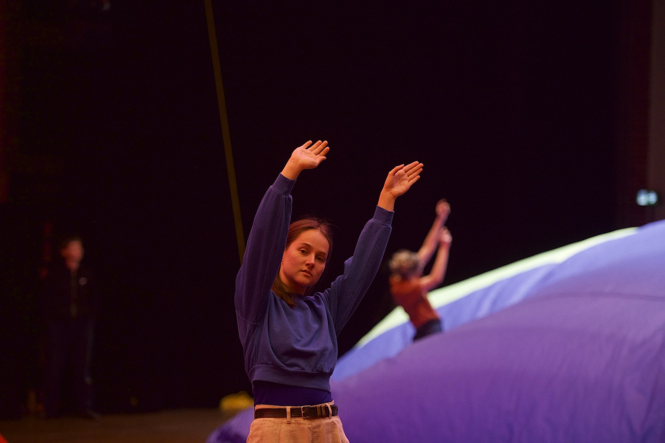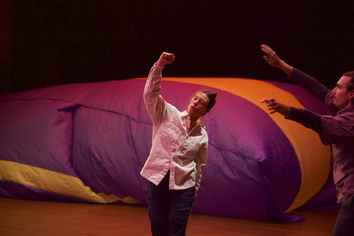 Die große Halle des Radialsystems V ist auf einmal ganz leer. Zwei überdimensionale Stoffobjekte (Sandra E. Blatterer) hängen vom Hallendach herunter, und ein großes Päckchen liegt am Rande der Bühne. Eine riesige Spielfläche für acht Tänzer*innen. Das „Zelt“ in der Mitte wird ein farbiger Leuchtkörper im Raumhimmel. Die beiden anderen Stoffobjekte werden mit Gebläsen aufgeblasen und entpuppen sich als weiche riesige „Kissen“. Bühne frei für den Tanz, einzeln, in der Gruppe, immer wieder in neuen Beziehungen. Zumindest bei der Generalprobe findet das Publikum seinen Platz
