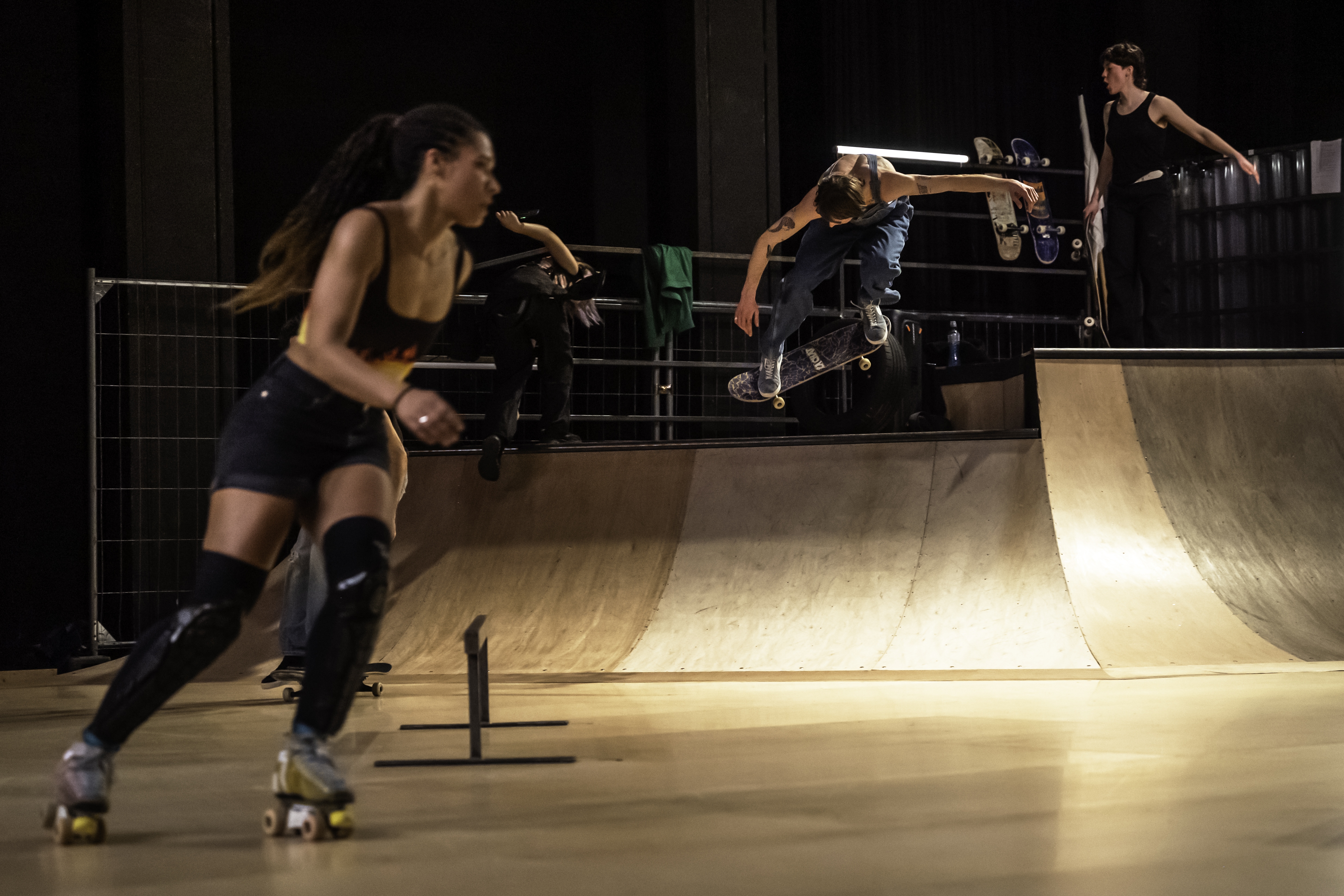 „Wenn wir normalerweise skaten, tun wir das mit vollem Risiko für Blessuren. Und gehen dann erst wieder in den Park, wenn wir ok sind. Aber in diesem Bühnen-Projekt skaten wir jeden Abend, da müssen wir unter unserem Limit bleiben“, sagt sinngemäß einer der trotzdem fulminant wirkenden Skateboarder in schlabbriger Latzhose aus der eben zu Ende gegangenen 80 Minuten kurzweiligen, lauten und auf Theaterwildheit getrimmten jüngsten Show „Skatepark“ von Mette Ingvartsen.