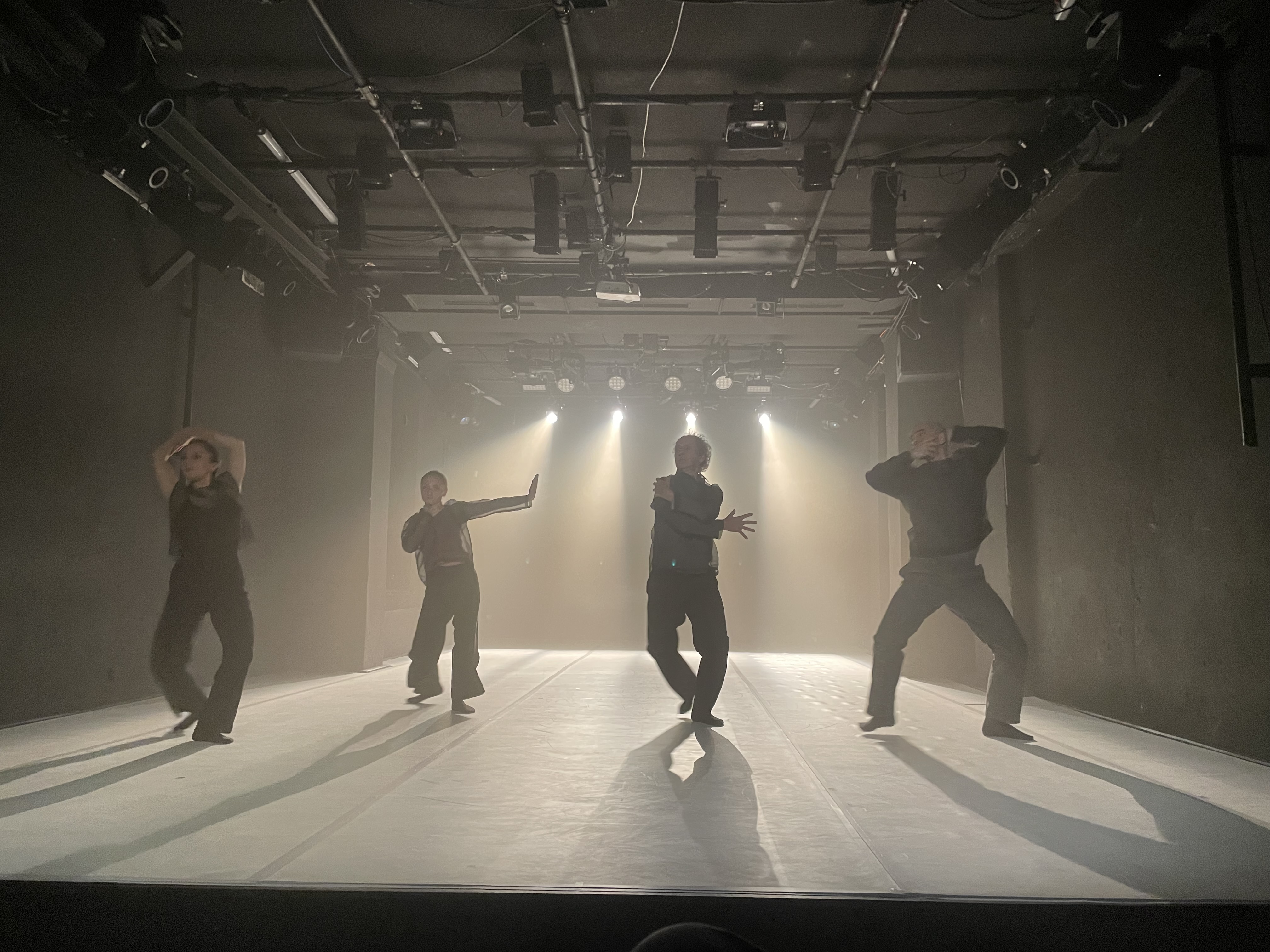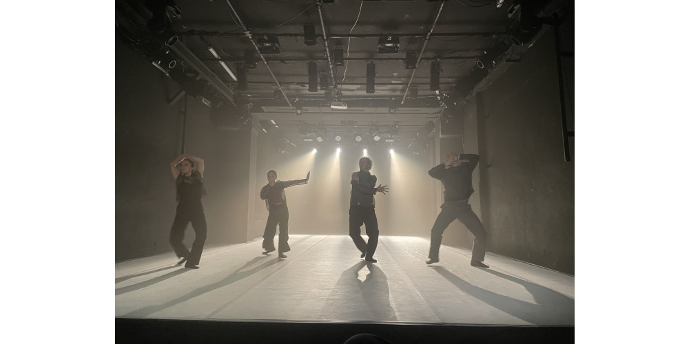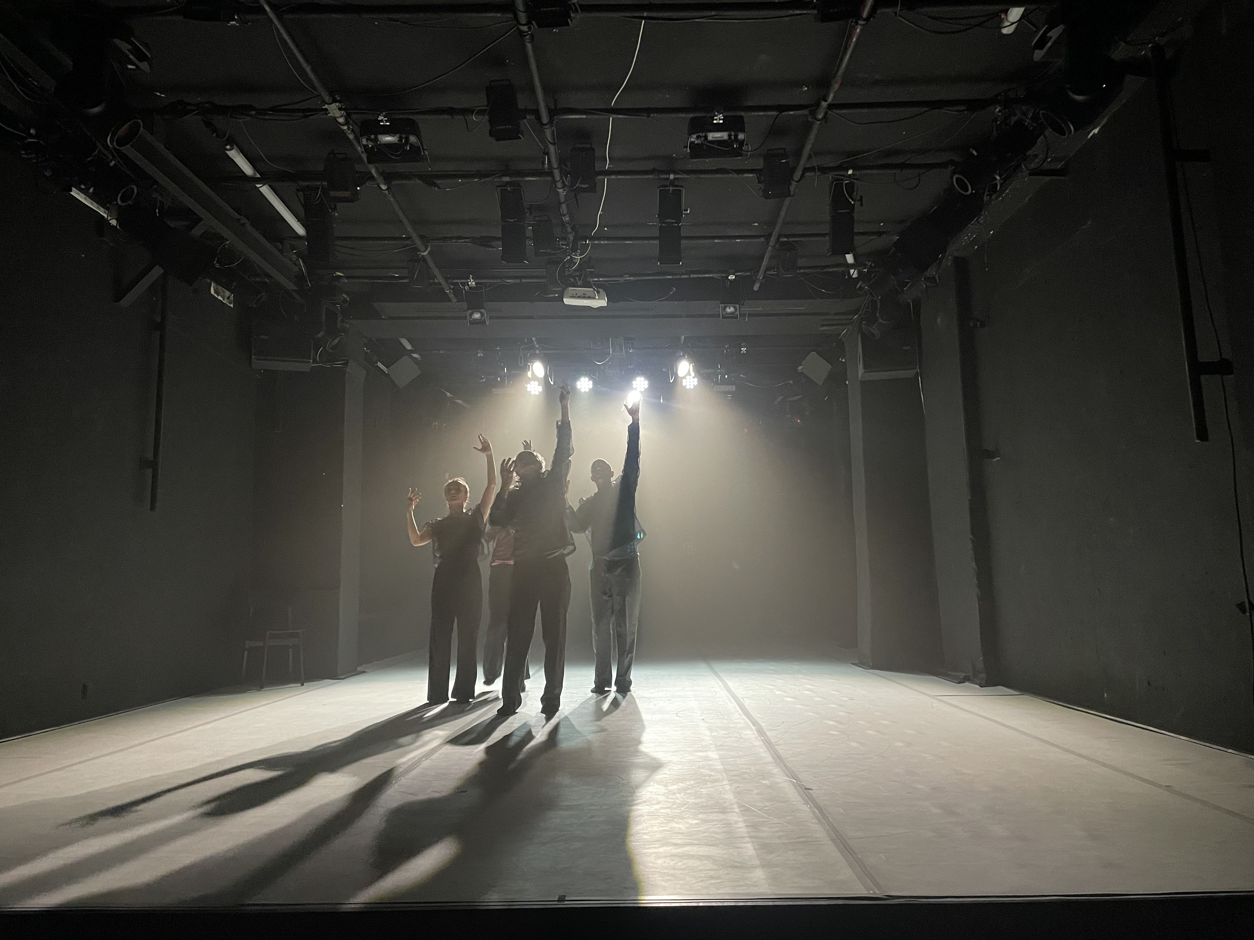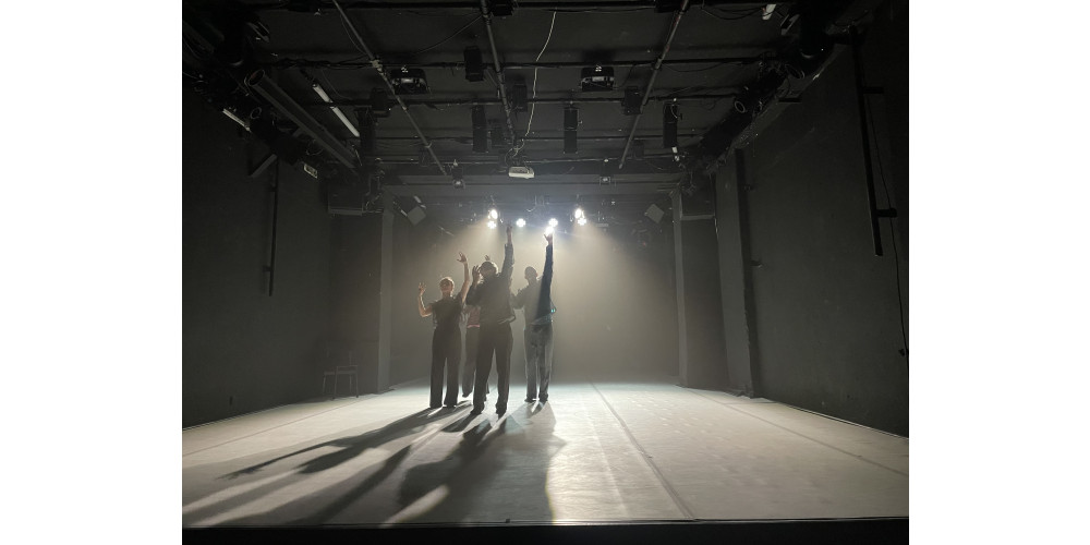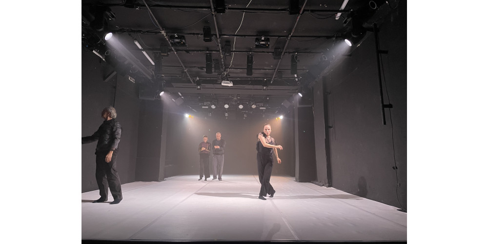 Johann Ju nutzt für sein Lichtdesign die eigenartigen Dimensionen der Bühne (relativ schmal, relativ tief) und schafft immer wieder neue Räume, die die Tänzer mal im Gegenlicht als amorphe Masse auf ihre Umrisse reduzieren, mal fast hinter einzelnen Spots verschwinden lassen. Am leichtesten lesen lässt sich das, wenn man die vier Tänzer*innen nicht individuell liest, sondern als einen einzelnen Menschen, der „jedes Alter“ gleichzeitig repräsentiert. Unsicher nach vorn tastende Jugend steht direkt neben reflektierter, von Zwängen befreiter Reife. Wenn sich Hannes Detlef Vogel zwischendurch für einige Momente am Rand auf einem Stuhl etwas Ruhe gönnt, ist das eben kein Aussteigen aus dem Prozess. Er bleibt dabei Teil der beständigen Bewegung, Teil des immerwährend ablaufenden Prozesses.