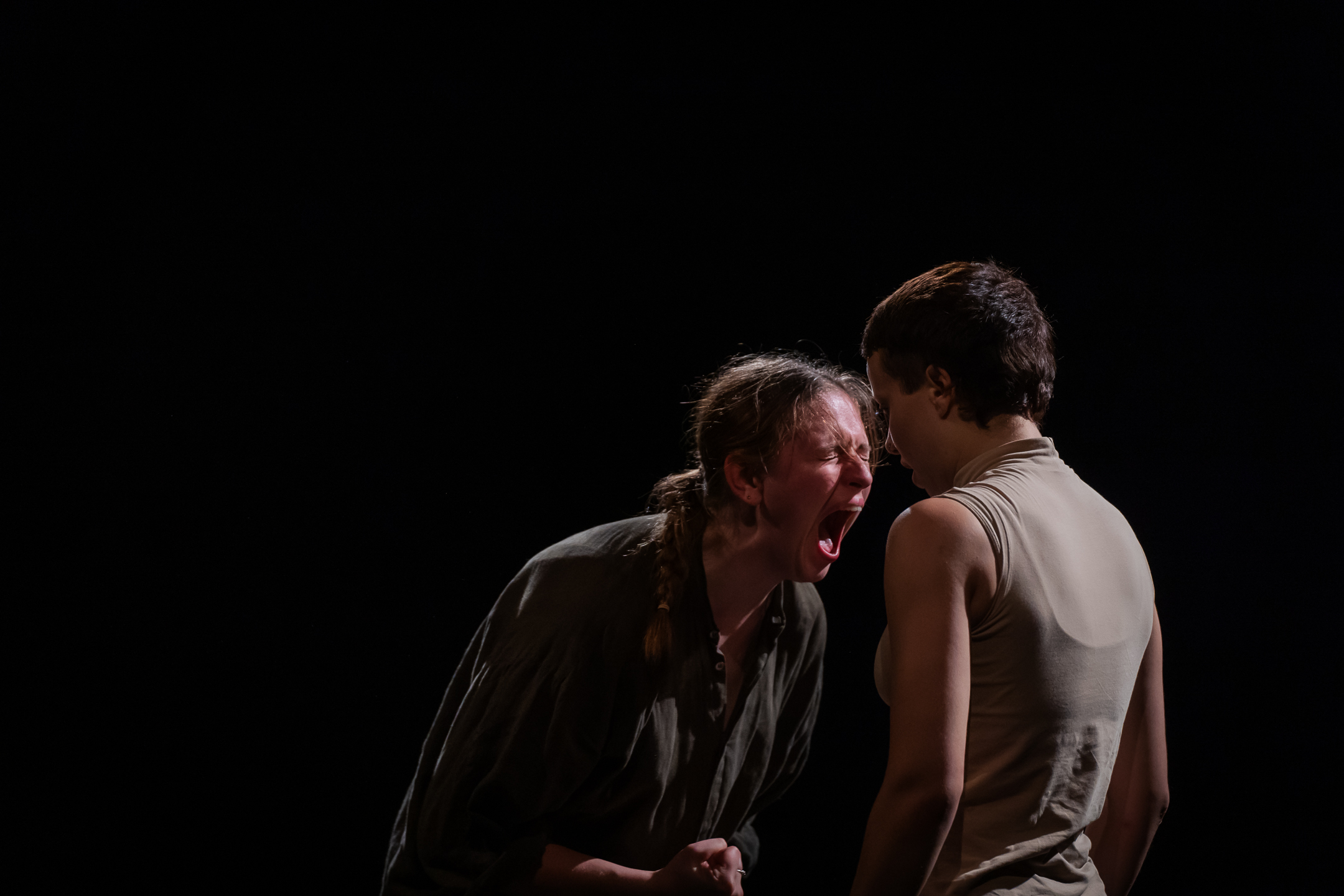 Mit der eigenen Mutter hatte nicht erst Freud zu kämpfen. Und er war auch nicht der Letzte, der sich an dem Konzept die Zähne auszubeißen drohte. Dass das Ganze aber auch gleichzeitig verspielt und leicht konfrontativ angegangen werden kann, zeigt am Ende einer lange Reihe von 13 Bachelor-Arbeiten in diesem Jahr Korbinian Friedl. Letztes Jahr wurde er mit dem Deutschland-Stipendium 2023 ausgezeichnet. Seine Arbeit „I Play With You“ ist tatsächlich wörtlich zu verstehen. Im Duo mit Patrick Short führt er das Publikum aufs Glatteis und an der Nase herum, indem er immer wieder dramaturgische