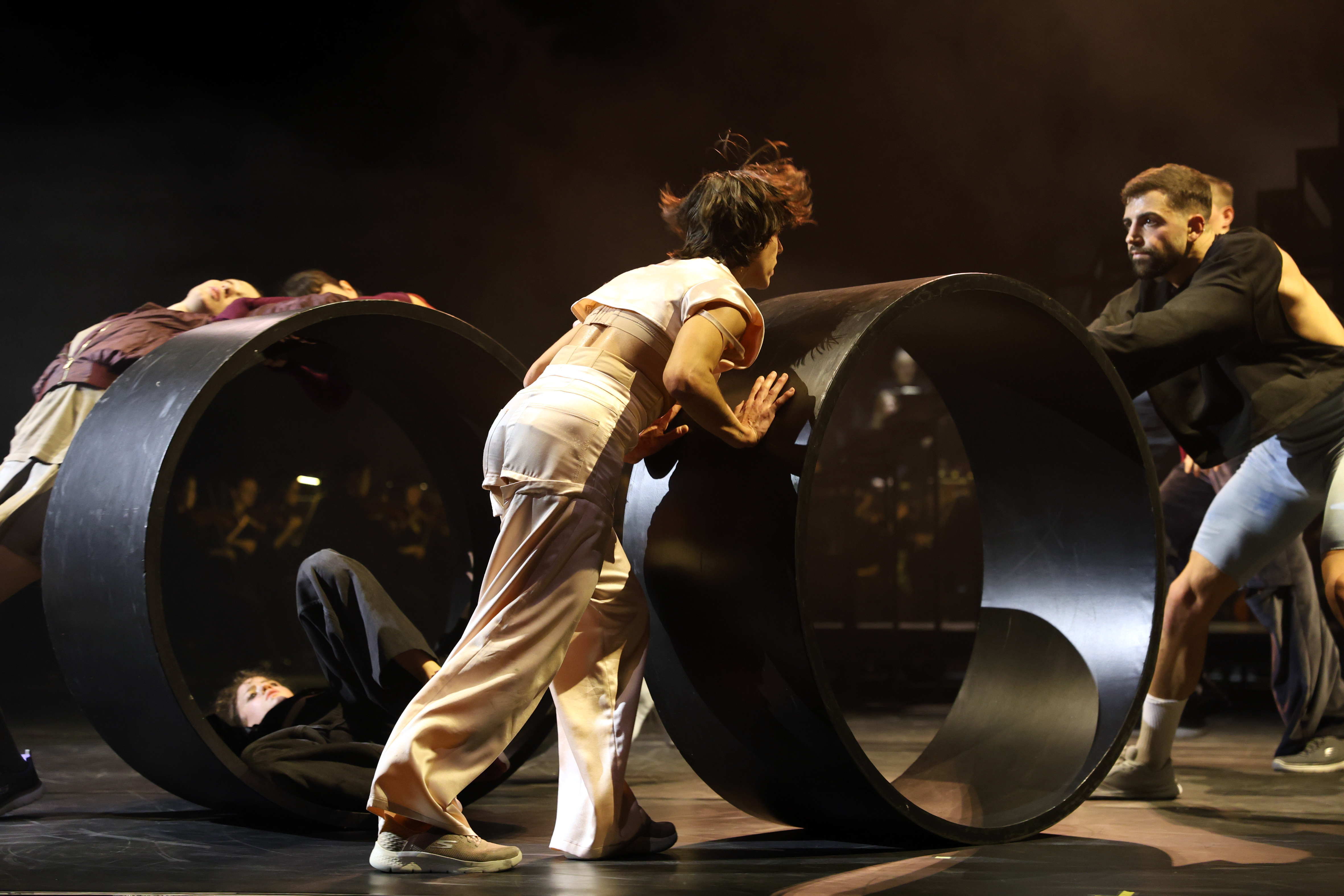 Vor der Uraufführung von „Carmina Burana – O Fortuna mit alles und scharf“ im Großen Haus des Musiktheater im Revier (MiR) in Gelsenkirchen gibt es im oberen Foyer auf zwei kleinen runden Bühnen parallel das Duett „Somos“ („Wir sind“) von Carla Cervantes Caro und Sandra Egido Ibanoz. Zu live gespielter Klaviermusik tanzen zwei Tänzerinnen, die Körper während der eher kurzen Choreografie immer miteinander verbunden. Der Dauerkontakt führt zu tiefer Nähe und Intimität. Die Arbeit hat übrigens beim Internationalen Duett-Wettbewerb 2024 in Rotterdam den Publikumspreis eingeheimst.