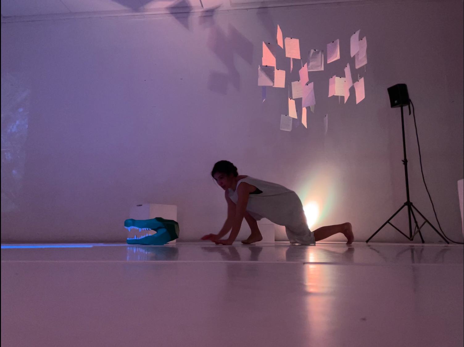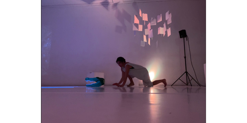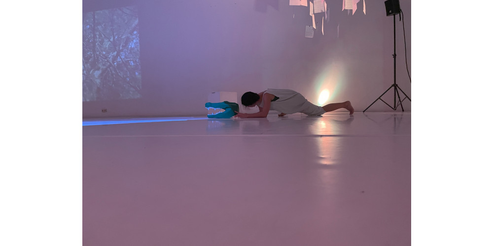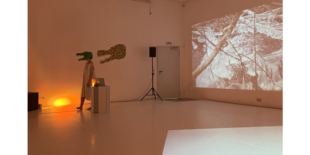 Und dann ist da das Krokodil: Es begegnet uns sowohl in einer Fotocollage an der Wand als auch in einem Krokodilkopf aus Pappmache, den Cristina D´Alberto in der Mitte der Performance aufsetzt. Zu dieser symbolischen Figur wurde die Performerin von Jaques Lacans psychologischer Theorie vom Archetyp der Krokodilmutter inspiriert, die in einem Akt ultimativer Besitzergreifung ihre eigenen Kinder angeblich auffrisst. (Tatsächlich fressen Krokodile ihre Kinder nicht.) „We all have also the crocodile mother in us“, sagt D´Alberto und wirft so die Frage in den Raum, wie sich mit den besitzergreifenden und ängstlichen Emotionen umgehen lässt, die Mutterschaft mit sich bringt.