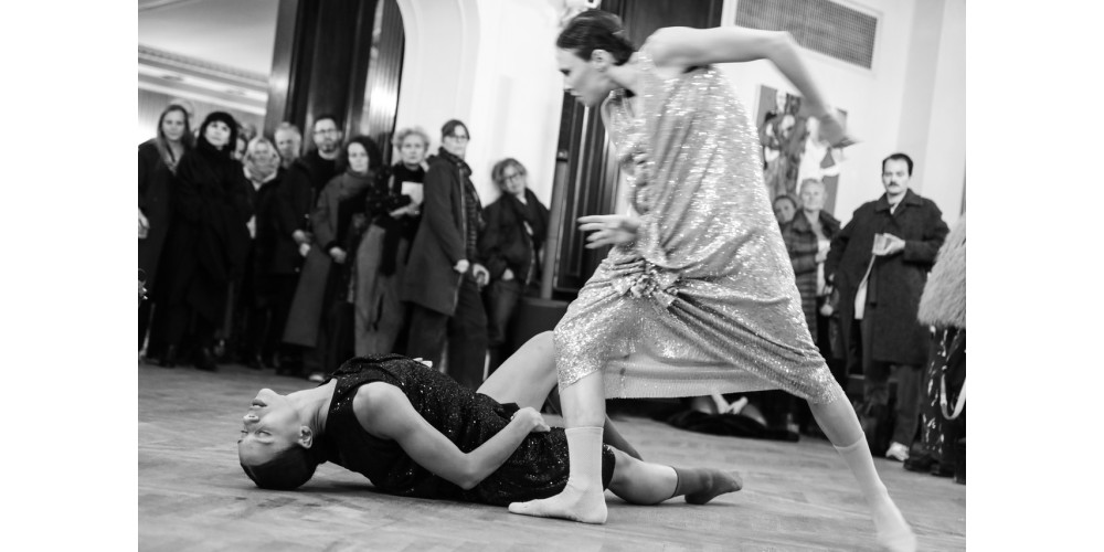 Davor aber lässt sich weit ausschreiten in der großzügigen Architektur, in der auch extra für den Anlass großformatige Körper-Bilder der zeitgenössischen Künstler*innen Annemarie D. Humele und Luis Casanova Sorolla hängen. Da entspinnt sich unverwandt zwischen den Schlendernden ein verführerisch-strenger Prolog zweier Frauen zum späteren grotesk-dunklen Tanzdrama. Horner und Schmidt umgarnen einander in fließenden Paillettenkleidern (von Arthur Arbesser). Da funkelt und blitzt es in den verschlungenen Gemeinsamkeiten, in denen eleganter Bewegungsfluss mit mancher Gefühls-Attacke zelebriert wird. Die eine drückt der anderen auch einen Kuss auf, im Hintergrund Vivaldi-Klänge.