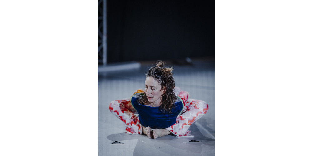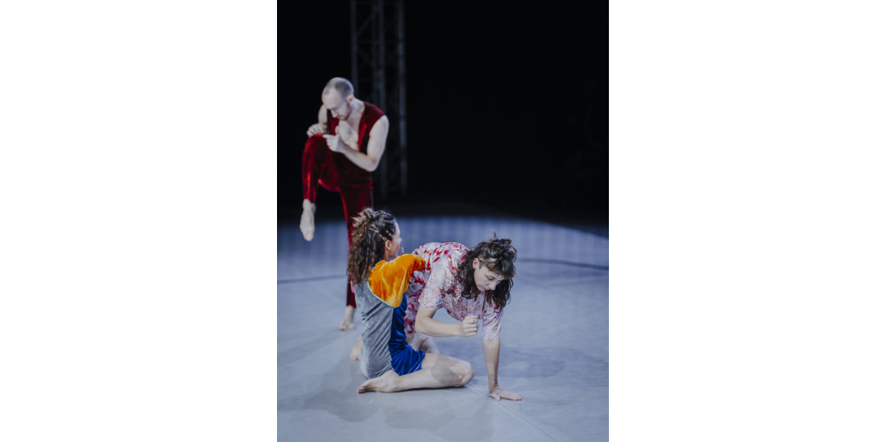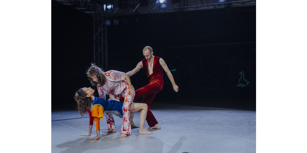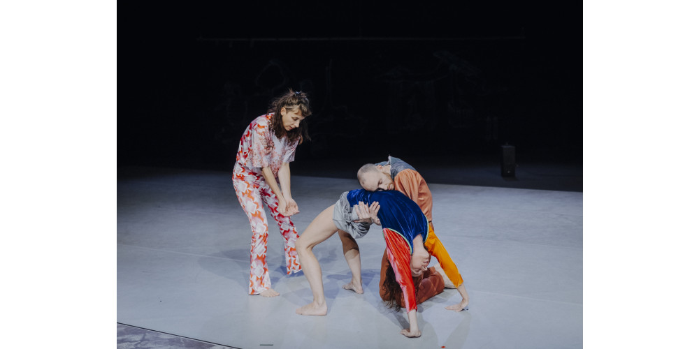 Als nach einigen Minuten die Leinwand fällt, sticht sofort der von Cécile Tonizzo mit fluoreszierenden Zeichen bemalte Hintergrundprospekt ins Auge. Aber auch, dass mit dem weißen Tanzteppich, Lautsprechern, einem präparierten Flügel sowie Stoffen eine Landschaft gestaltet wurde. In dieser bewegen sich die drei Tänzer*innen Cécile Tonizzo, Hugo Le Brigand und Alix Eynaudi. Mal zusammen, mal alleine erkunden sie die Möglichkeiten des Raumes und loten ihre Bewegungsradien aus. Wirken teilweise entrückt und ganz in sich gekehrt, dann wieder mit der Umwelt sowie ihren Kolleg*innen verbunden. Die Soundscapes von Paul Kotal sind düster, aufgehellt wird die Stimmung durch die von Han-Gyeol Lie beeindruckend komponierten und gespielten Klavierpassagen. An Breugelmans holte sich für die bunten Kostüme, die öfters gewechselt werden, Inspirationen im asiatischen Raum.
