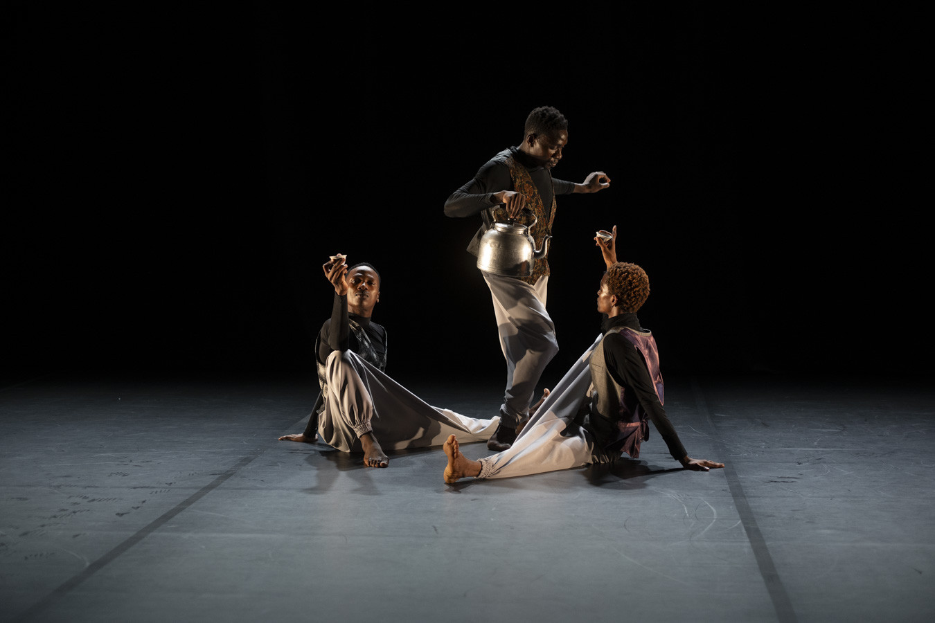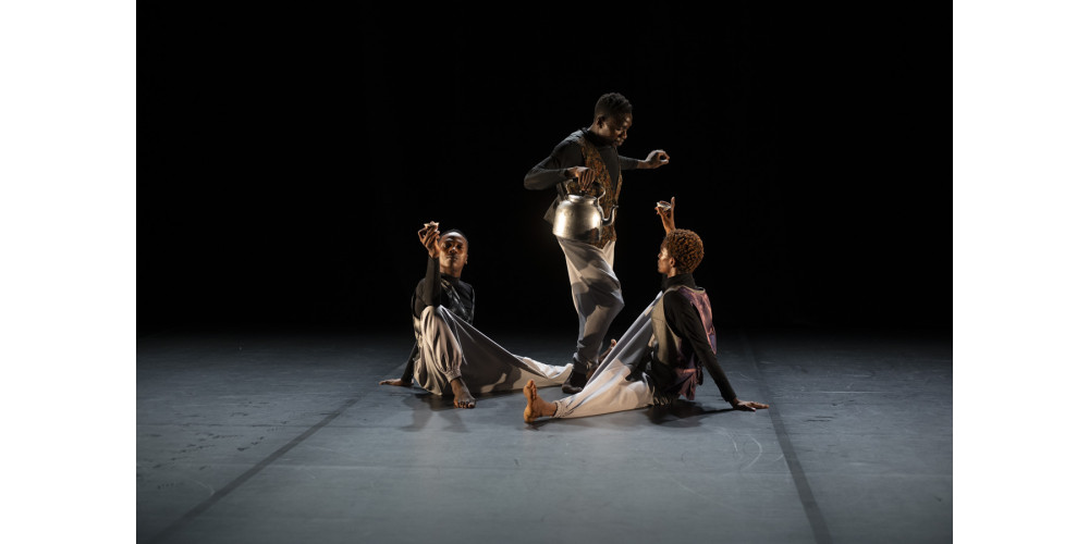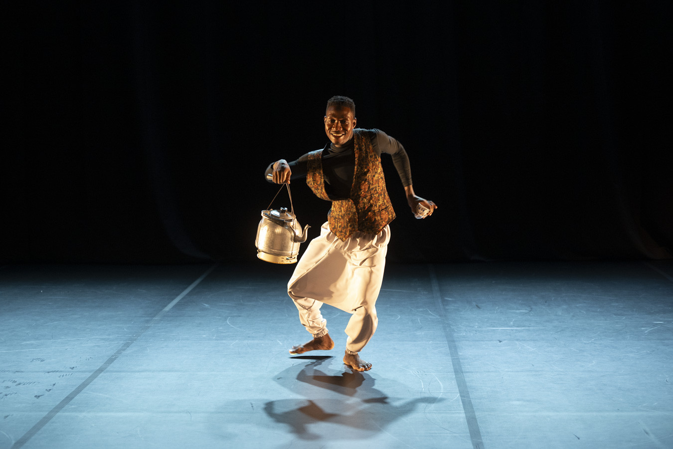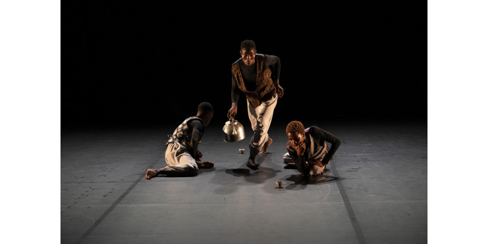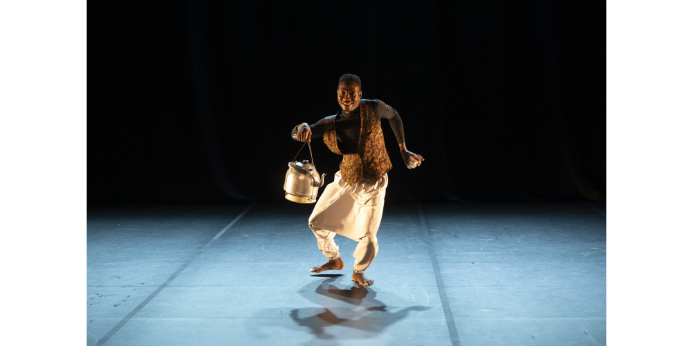Mit „Frozen Power“ von Ian Mwaisunga tauche ich in die Welt von Tansania ein. Mit einem Kaffeeverkäufer (Ulonzi Almazi) beginnt eine Reise. Ein kleiner Tisch, eine Kaffeekanne und einige Kaffeeschalen sind die einzigen Requisiten. Der scharfe Blick des Kaffeeverkäufers fixiert im Publikum Kunden für den Kaffeegenuss, und schon ist er im Publikum und bietet seinen Kaffee an. Zu den Klängen von Mbwana Mtulia (D’bass Ganun) bin ich auf einmal in der magischen Welt Afrikas.