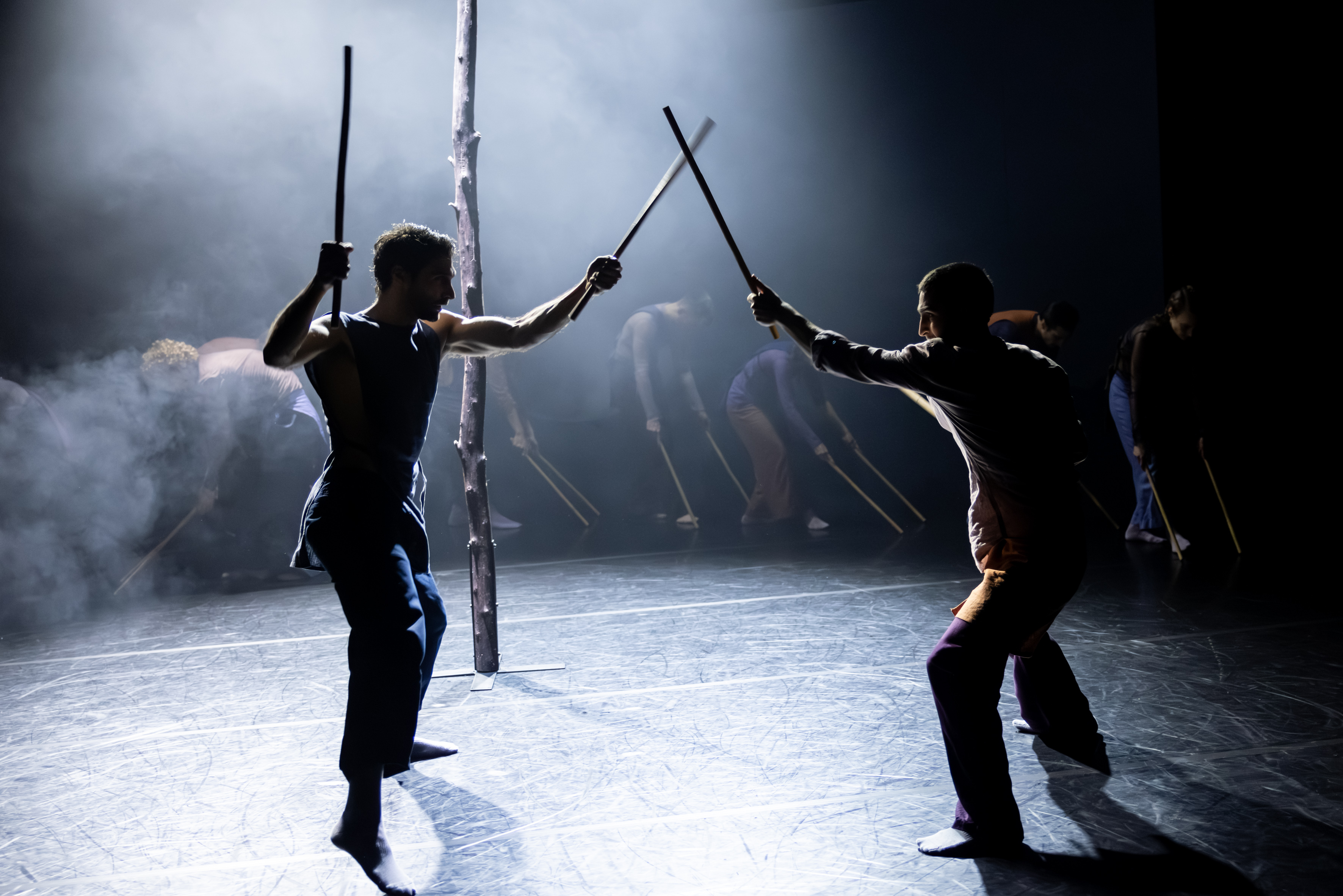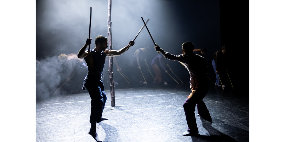 Später entspinnt sich mit hölzernen Stäben ein dynamischer Kampf jeder gegen jeden. Wie in einem Fechtkampf auf Leben und Tod, wunderbar zum stampfenden Rhythmus der Musik choreographiert, schlägt ein jede*r wuchtig auf die Stäbe der anderen ein. Allen leuchtet die Freude an dem gewaltigen Kräftemessen aus den Augen, während sich im Publikum die Sorge breitmacht, ob das nicht übel enden muss.