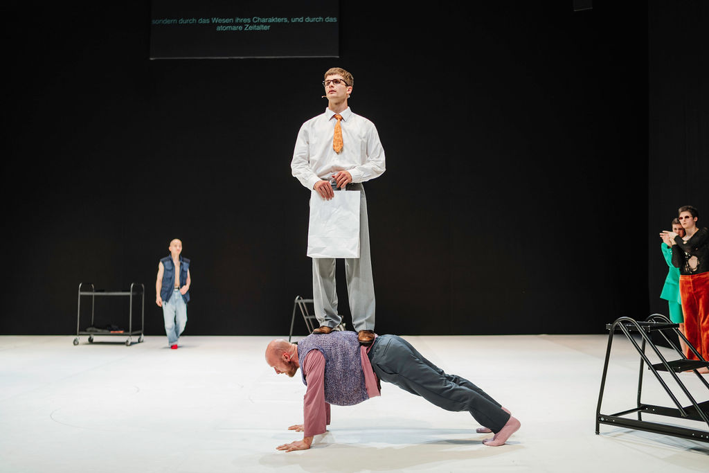 Es hat etwas Kafkaeskes an sich: Ein Mann (Alessandro Ottaviani) scheint seinen Tag zu beginnen, etwas steif, leicht orientierungslos, unentschlossen. Er probt, ganz für sich, eine Begrüßung. Seine Bewegungen dabei sind merkwürdig. Verkrampft, zuckend, wie außer Kontrolle. Das hat etwas sonderbar Schrulliges. Einzelne Aspekte dieser ersten Szene erscheinen wie der Realität entrückt. Ottaviani gibt in „Labyrinth“ als Performer „eine sarkastische Kopie irrer Populisten“, wie es das Choreografen-Duo Chiara de Nobili und Alexander Miller nennt. Wie durch einen Alptraum zieht es ihn durch