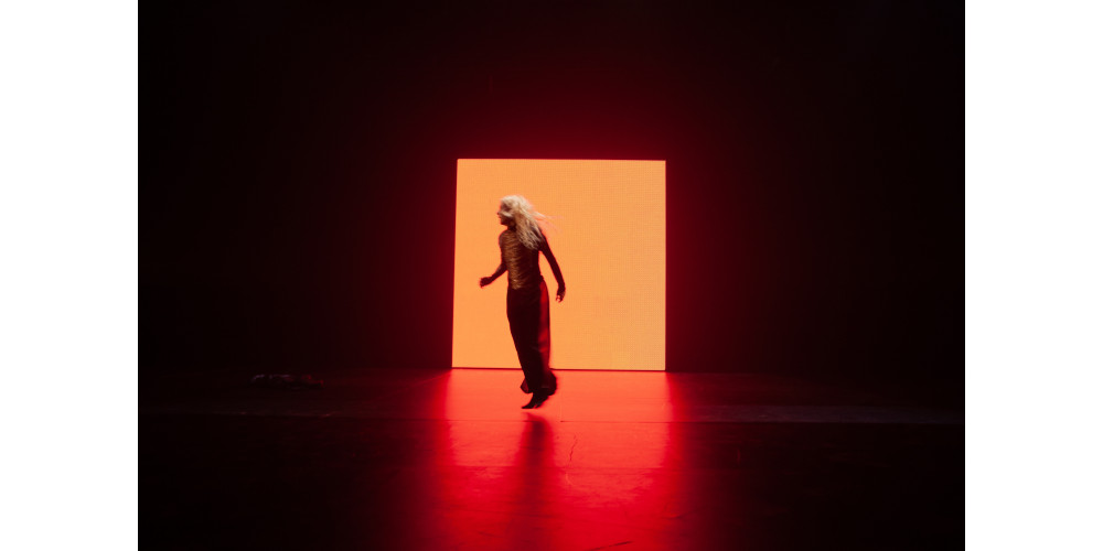 Von dem bodenlangen Mantel abgesehen bleibt sie auch hier ihren Kostümen treu, genau wie auch der Bühne: eine quadratische Spielfläche, die immer ihr persönlicher „Battleground“ ist, wie auch eine ihrer letzten Arbeiten heißt. Auch hier wieder das geometrische Bewegungsmuster über diese Fläche, gerade Linien, die immer wieder durch entsprechende Lichtbalken sichtbar gemacht werden. Auch hier wieder das Spiel mit LEDs. Waren es in „Stations“ vier Säulen mit entsprechenden Lichtern, ist es hier eine quadratische Wand an der Rückseite der Bühne. Vor ihr, im gleißenden Licht, Louise Lecavalier als Silhouette.