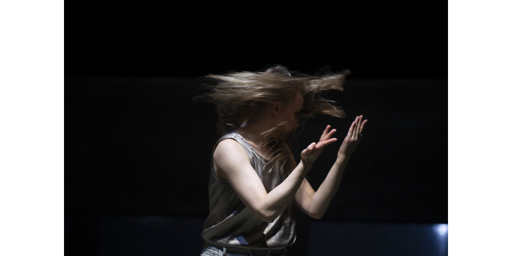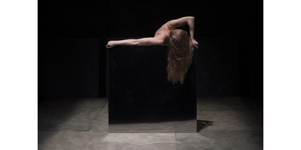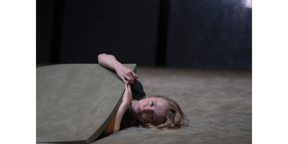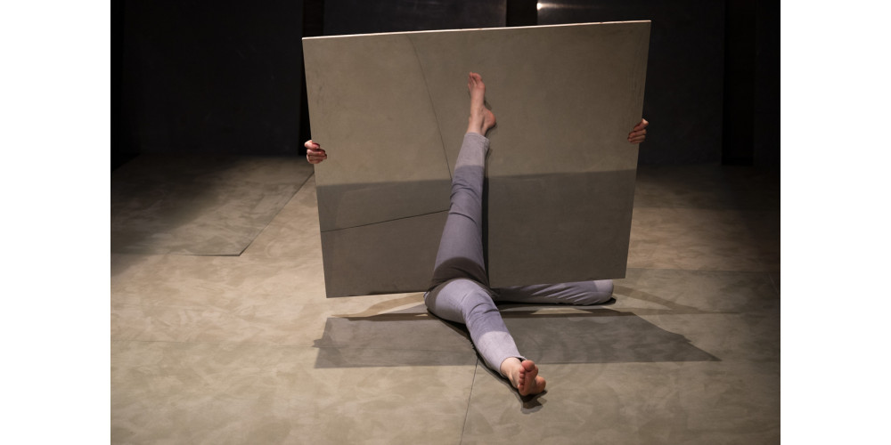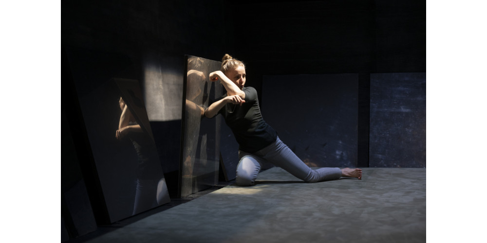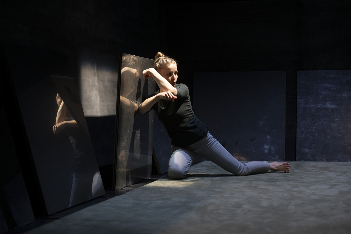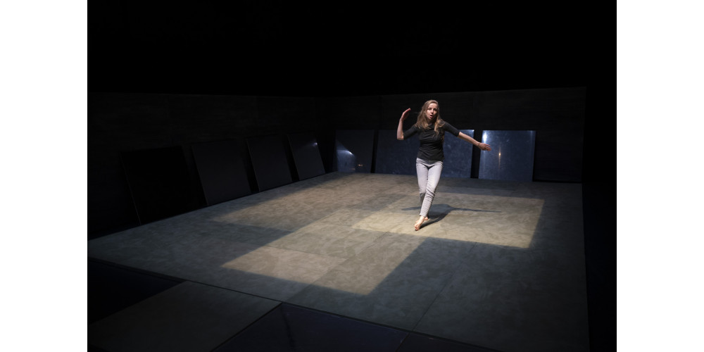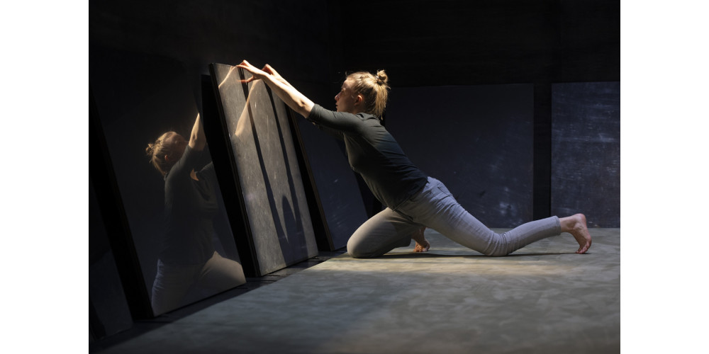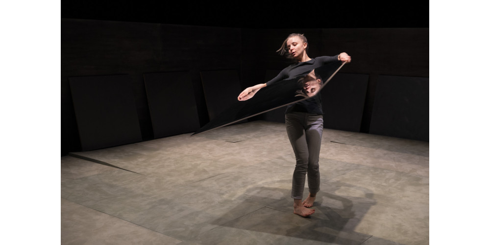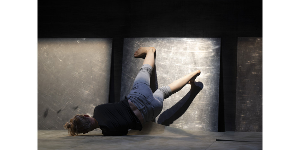 Das Bühnenbild überrascht: Schräg im Raum gestellt, zwei halbhohe Trennwände, an die sich quadratische, schräggestellte Stahlplatten und zwei Spiegel anlehnen. Grüne Matten und zwei Spiegelflächen bilden die Tanzfläche. Vorn am Rand der Soundtisch von Raoul Lesage. Beim Einlass empfängt Josephine Findeisen einen auf der Bühne. Mit Drehbewegungen erobert Josephine den Raum. Das Licht von Fabian Bleisch ist von oben streng auf die Tanzfläche gerichtet. Durch unterschiedliche Lichtintensitäten wird der Tanzboden strukturiert. Zu Beginn sind die Stahlplatten und Spiegel noch in diffusem Dunkel. Über Mikrofone im Boden werden Bewegungen der Tänzerin hörbar und spürbar, teil des Sounds von Raoul Lesage. Auch Stahlplatten werden mit ihrem metallischen Klang zum Instrument. Das Licht fällt nun auch auf die einzelnen Stahlplatten und Spiegelflächen. Der Tanz von Josephine arbeitet sich entlang der Stahlplatten ab. Je nach Sitzposition spiegelt sich der Tanz von Josephine in den Spiegeln. Der Spiegel wird auch zum Tanzobjekt, wirft Spiegelbilder, gerät in Bewegung und verteilt das Licht auf die Bühnenwände. Zum Schluss intensiver Sound, schnelle Tanzbewegungen, sodass die Kamera fast passen musste.
