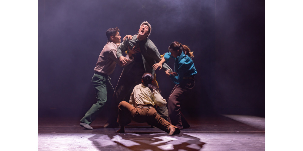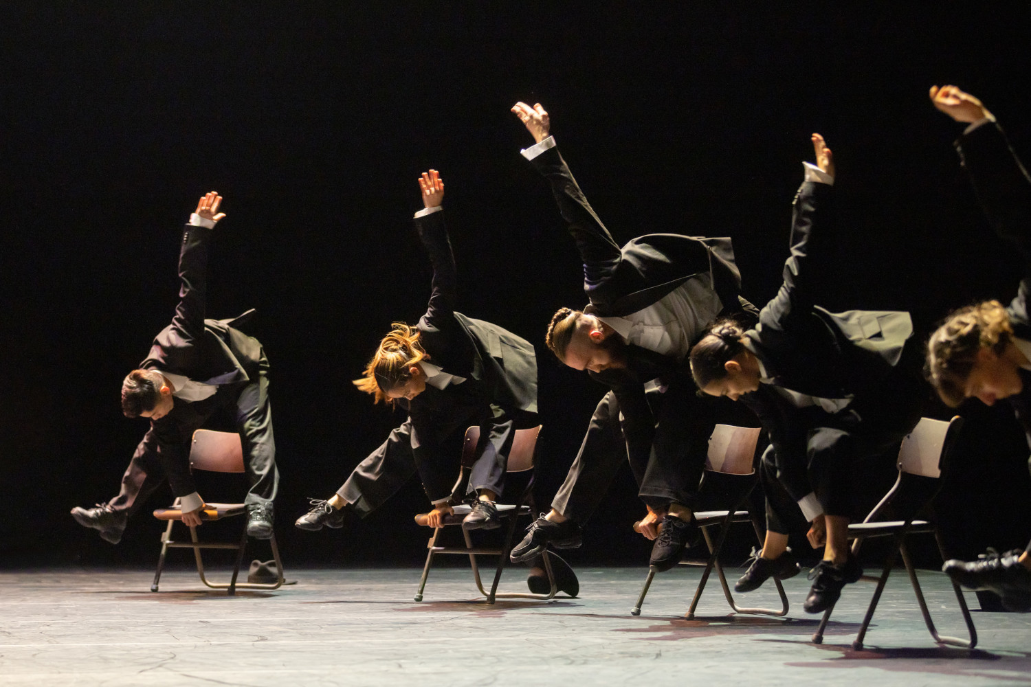 Dass sie dem herausfordernden Stück gewachsen sind, stellen die Tänzerinnen und Tänzer in der sich stetig steigernden, fast rauschartigen Ritualhaftigkeit der zentralen Sequenz unter Beweis. Zu der Rockversion des Pessach Liedes „Echad Mi Yodea“, die ordentlich das Zwerchfell zum Vibrieren bringt, entfalten sie im Stuhl-Halbkreis ekstatische Energie bis sie sich während der letzten der 13 Strophen sukzessive Hemden, Schuhen und Hosen schleudernd entledigen.