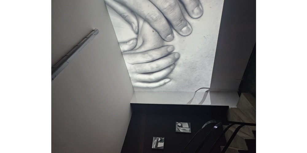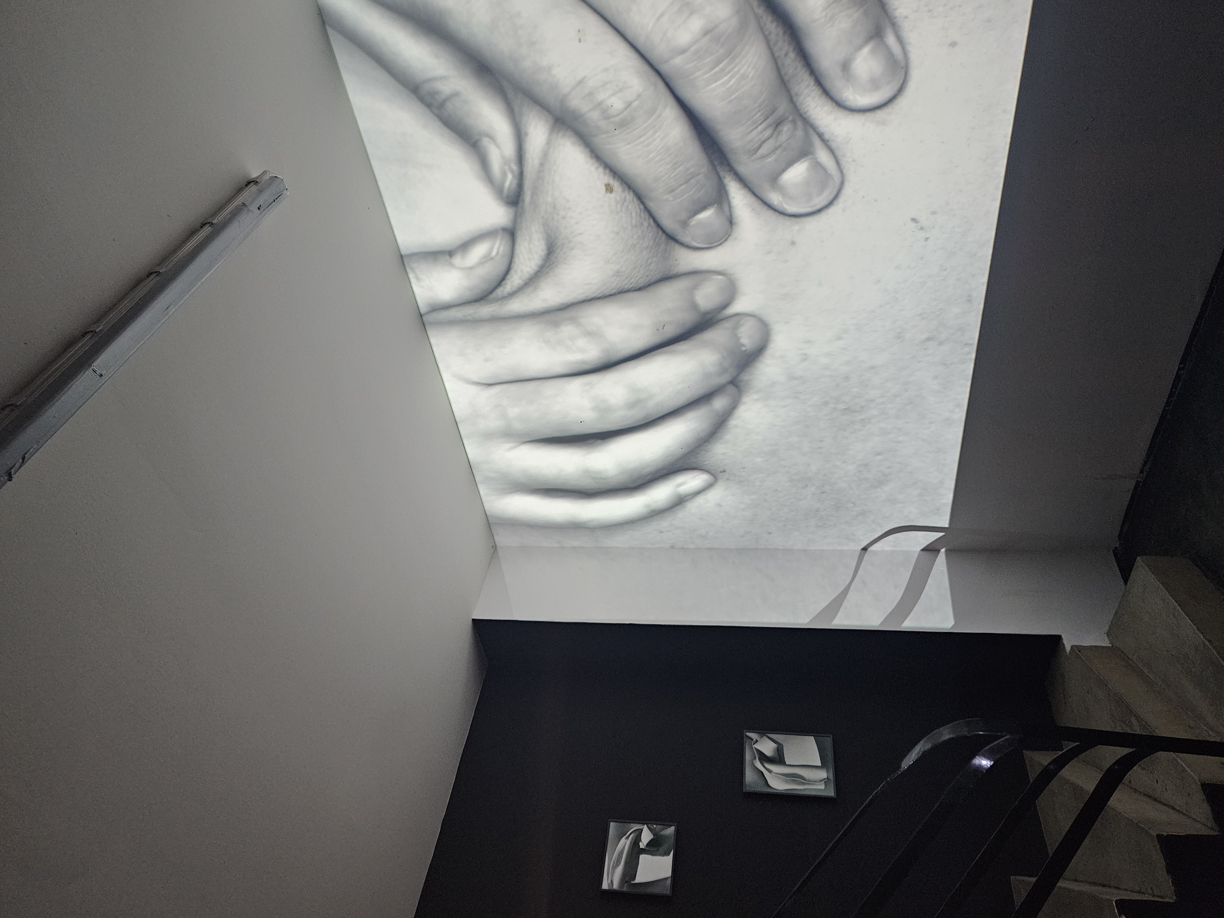 Jetzt erst sehe ich hinter der Scheibe draußen die Performerin – ihr weißer Rücken bildet eine Fläche unterhalb der Bilder von Jaffé. Als sie aufsteht und parallel zur Scheibe stehen bleibt, bildet ihr Körper zu den Bildern eine Linie von der Schulter abwärts. Dann betritt sie den Raum, nimmt in ihm einen Ort ein und ist ein weiterer Körper zwischen Video, Malerei und allen auf sie konzentriert Anwesenden. „So far... so far... so close bist du“, spricht die Performerin. Wir lauschen den Wörtern, greifen nach ihrem Sinn und blicken derweil auf Faltungen von Haut, Stoff und Bildern. Dann bewegt sich Schöchlin in den oberen Raum und steht an der Durchreiche. Hier legt sie ihren Kopf und Oberkörper mit ausgestrecktem Arm auf der schmalen Fläche der gemauerten Wand ab. Ihr Körper wird zur Landschaft im Raum. Oder ist er ein Objekt, wenn sie wieder aufgerichtet einen Arm über die Durchreiche entlang der Wand vom unteren Raum fahren lässt und den anderen Arm in der Rahmung aufstellt, den Kopf dreht und wie eine Figurine einfriert? Erst als Schöchlin anfängt zu singen, transformiert sie die Performance in eine weitere Dimension. Alles, was die Anwesenden vorher auf Distanz gehalten hat – das endlos geloopte Video mit Hand auf Haut, die überblendete Kunst, die dem immer wieder neu gefalteten Stoff zum Muster verhilft, der Körper als Skulptur im Raum – wird schlagartig in die Nähe gezogen, eine zutiefst menschliche Nähe. „Ain’t no mountain high enough, ain’t no valley low enough, ain’t no river wide enough...“ hebt die Künstlerin mit ihrer Stimme leise, fast zögerlich zu singen an und wiederholt den Liedtext, den Marvin Gaye und Tammy Terrell 1967 berühmt gemacht haben, immer wieder noch einmal von vorne. Es ist der zarte eindringliche Klang der Stimme, der uns unmittelbar berührt, uns mitten ins Herz trifft.