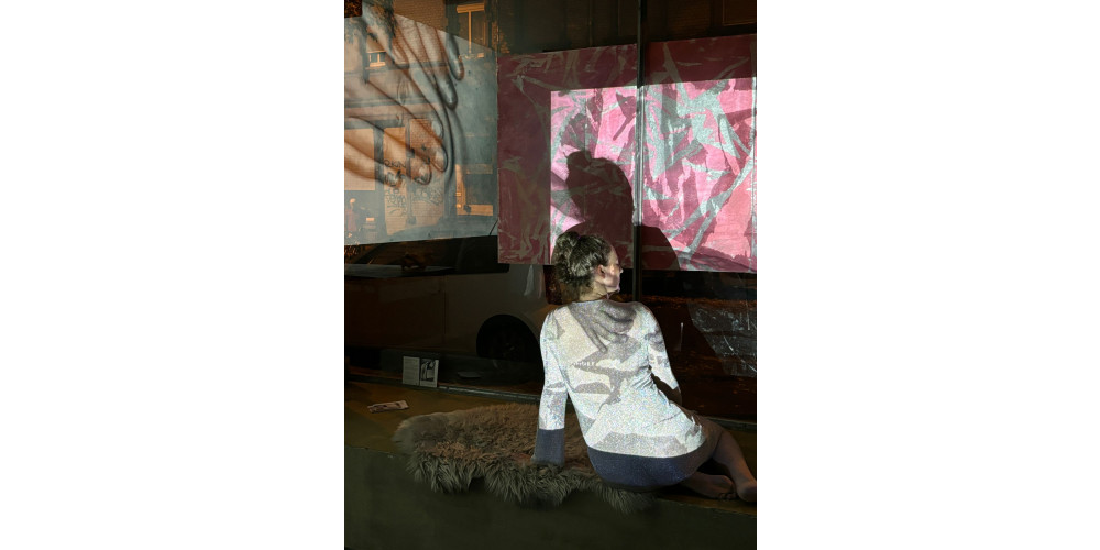 Draußen vor dem großen Schaufenster des Kreativraums Langer auf der Mannheimer Langstraße sitzt die Performerin Vivian Schöchlin. Drinnen steht das Publikum verteilt auf zwei Räume, dem ebenerdigen und einem oberen mit großer Durchreiche, aus der man ungehindert den unteren Raum überblicken kann. Ich blicke auf das Schaufenster, ohne die Performerin draußen zu sehen, denn an der Scheibe bleibt mein Blick hängen bei den zwei Arbeiten der Malerin und Objekt-Künstlerin Valentina Jaffé – es sind auf Seidenpapier mit Tinte und Gouache gemalte Formen zu sehen, farbige Formen, die dem Weiß des Papiers mehr Raum und mehr Perspektive verleihen. Für die Performance „Restrictions“ sind sie mit einem Video überblendet, das ihre Qualitäten auszudehnen scheint. Sieht man genau hin, muss es sich auf den Videos von Schöchlin um einfarbige Stoffe handeln, die erst durch die Bildformen von Jaffé zum Muster belebt werden. Hände schieben den Stoff zusammen, seine Falten ergeben neue Landschaften oder sie dehnen ihn wieder auseinander in die bemusterte Fläche. Dazu ergänzt ein weiteres Video auf der stirnseitigen Wand den Eindruck von Fläche, Körper und Landschaft. Es zeigt menschliche Haut, auch von Händen berührt und in Falten geschoben oder geknetet.