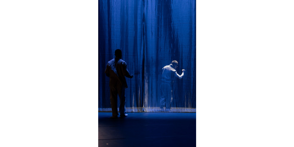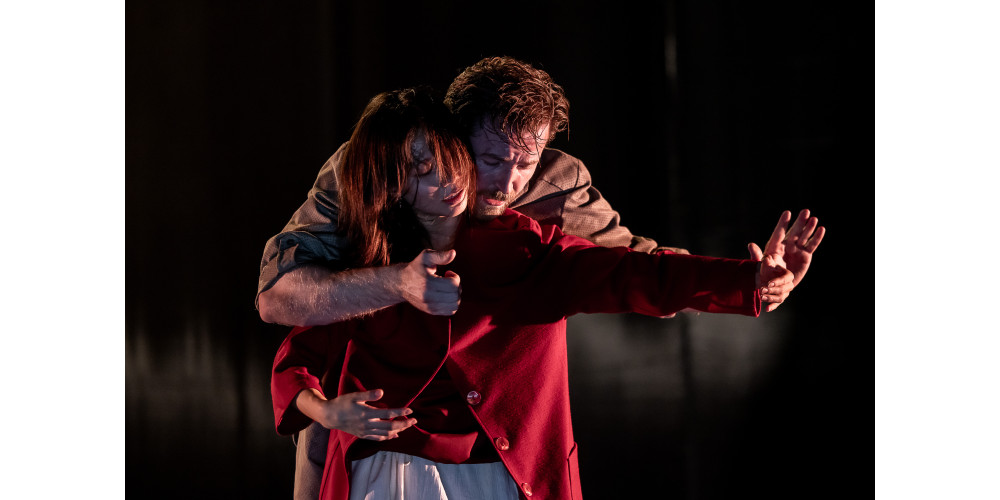 In der Gruppe lassen sich einzelne Figuren erkennen, ein Paar, Mann und Frau, getanzt von Egon Gerber und Elina Kim, die ihre Beziehung nach außen hin so gut sie können auf Basis jener Erwartungen ihres Umfelds gestalten. Immer wieder mit höflichem Gesichtsausdruck brav ausgeführte Kotaus. Um die Regeln zu befolgen. Um zu gefallen. Um Akzeptanz zu finden. Das Verbiegen der eigenen Identität ist die Folge. Nach innen, in ihrer Beziehung, suchen sie aneinander Halt, vermitteln sich gegenseitig Stärke, so gut sie es können. Dieser Schutz ineinander gelingt aber nur bedingt. Nicht selten werden dafür enorme Opfer erbracht. Das wohl eindrucksvollste Bild genau dafür gestaltet Kaltuk, indem er die kleine, fast schmächtig wirkende Frau den großen, starken Mann tragen lässt. Diese Symbolik ist so schlicht wie äußerst wirksam.