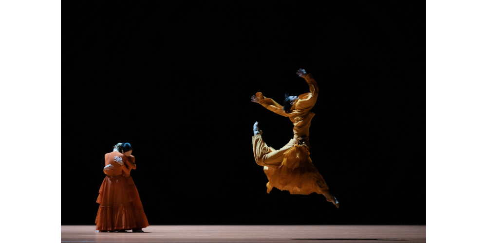 „Slow Burn“ beginnt mit zwei Frauen in orangefarbenen Kostümen auf schwarz abgehängter Bühne (mehr Bühnenbild gibt es nicht). Und es ist ein wirklicher Gewinn dieses Abends, dass er uns Silvia Azzoni zurückgebracht hat, die immer noch eine zwingende Bühnenpräsenz mit sich bringt und nach wie vor eine absolut überzeugende Stilistik und Technik. Für Madoka Sugai, die zweite im Bunde, gilt das nicht minder. Und so sind es vor allem diese beiden, die das Stück durch die 60 Minuten tragen.
