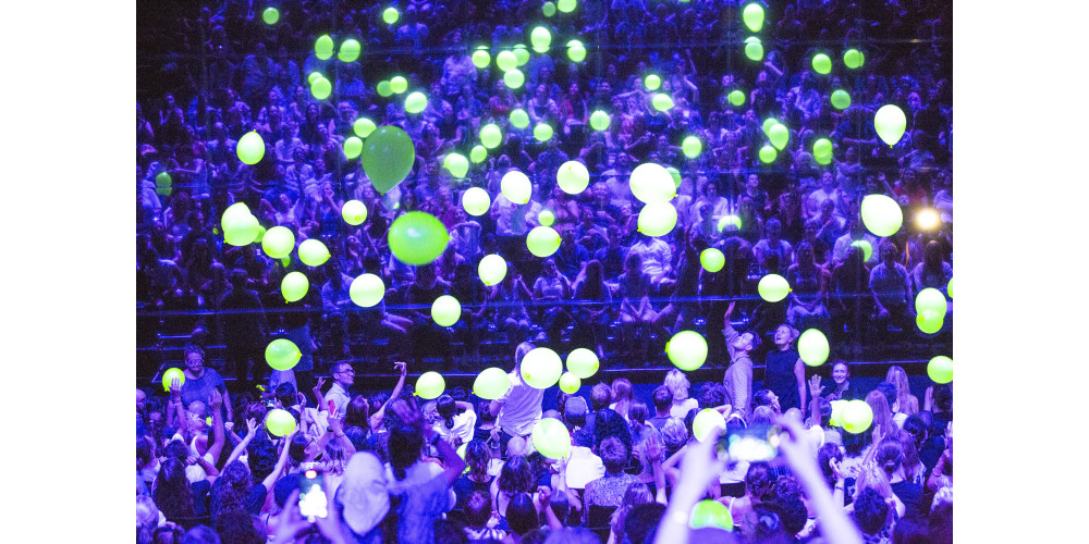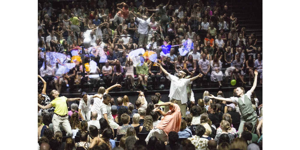 Plötzlich greifen einige in die Tasche und befördern grellgelbe Luftballons hervor, die flugs aufgeblasen werden und sich über das Publikum verteilen (und hier wird zum ersten Mal deutlich, dass Animateure in der Menge sitzen) – auch das ein tänzerisches Spiel, bis sie wieder gezielt eingefangen und unter den Sitzen versteckt werden.