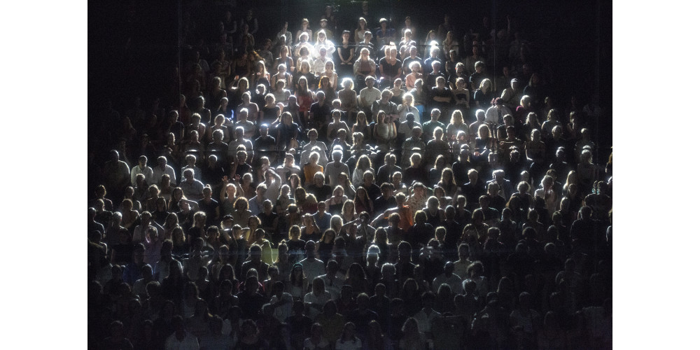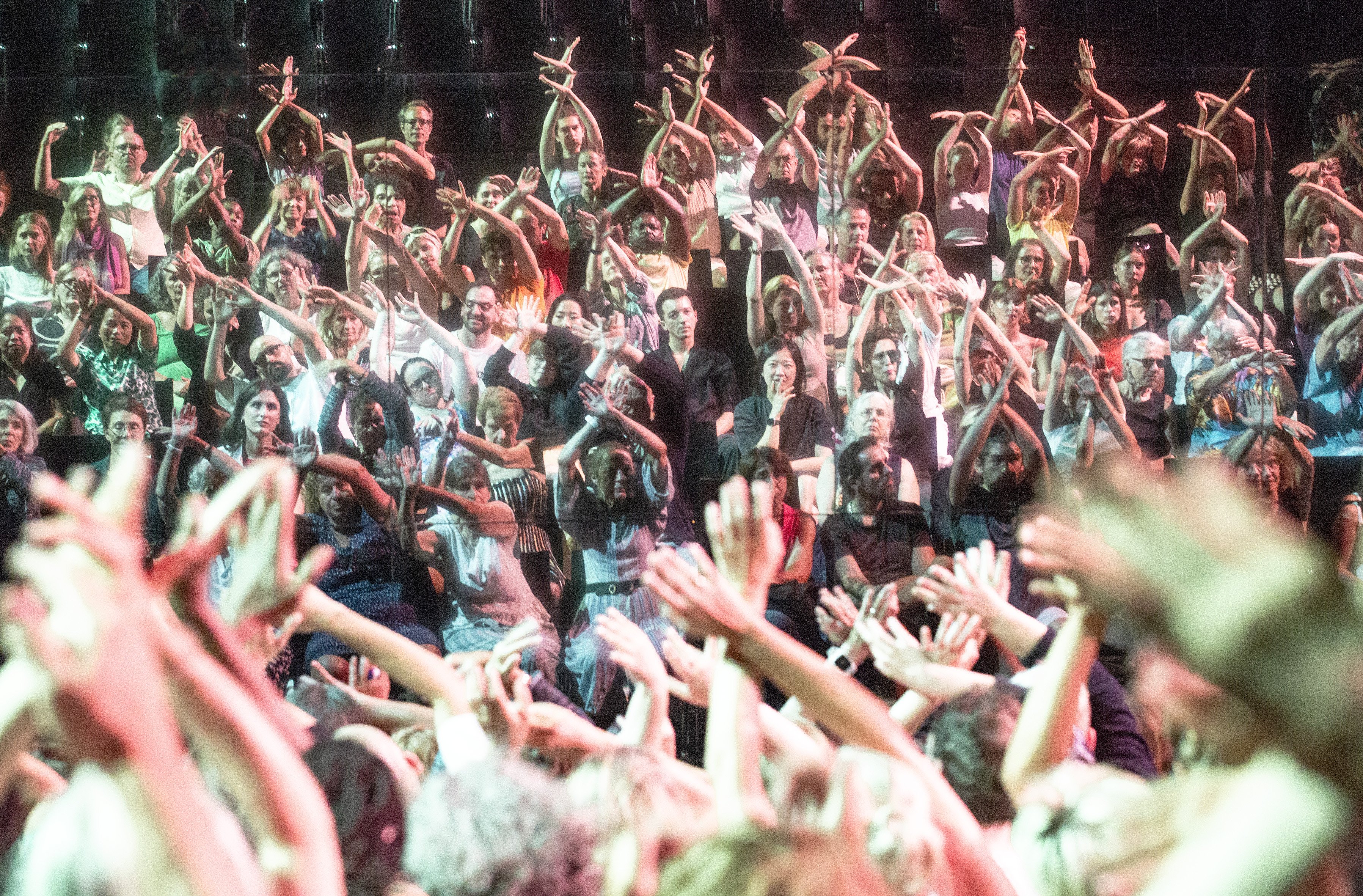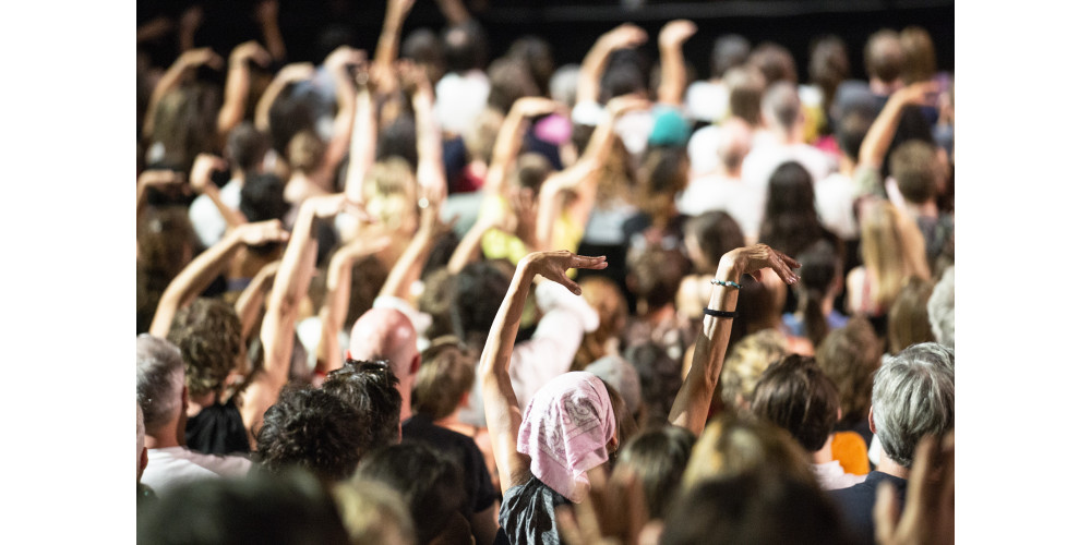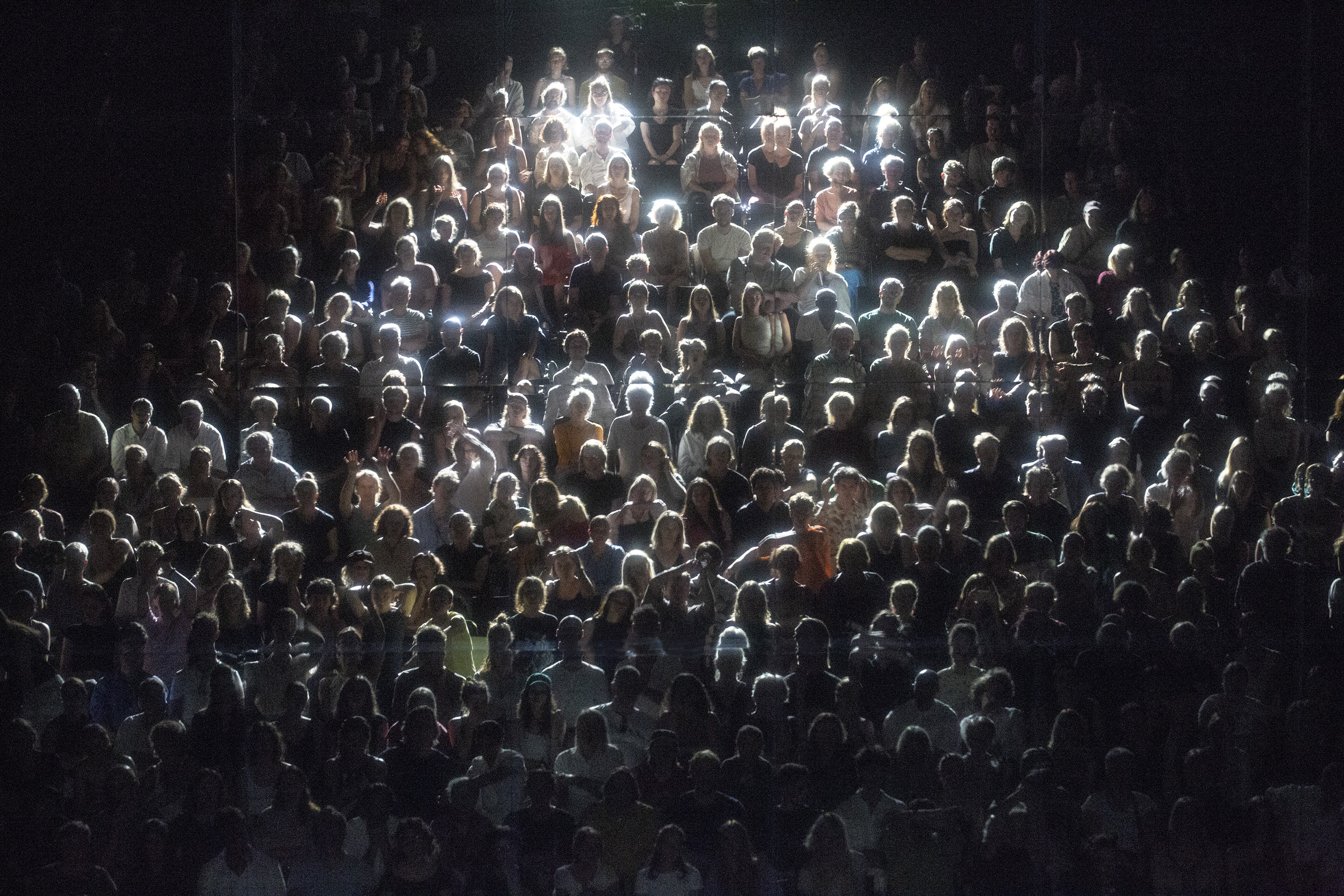 Angeheizt wird das Verhalten der Menge durch die im Publikum verteilt sitzenden, aber als solche nicht erkennbaren Tänzer*innen. Sie geben immer wieder Impulse, ohne dass dies als solches wirklich klar ist. Das wirkt animierend, und es kommt sogar so etwas wie eine „La Ola“ zustande, die man aus den Fußballstadien kennt. Mit der Zeit wird die Menge mutiger. Was, so fragt eine Stimme aus dem Off, würde wohl passieren, wenn das Miteinander noch etwas intensiver würde, zum Beispiel, indem man sich an der Schulter berührt? Wo beginnt, wo endet der Bereich, der nur zu einem selbst gehört? Wo kann und will ich mich mit den anderen verbinden? Und wieder entstehen erstaunliche Bewegungsmuster – man reicht sich die Hände, auch über die Reihen hinweg, man lehnt den Kopf an die Schulter des Nachbarn, und irgendwann tanzt das ganze Publikum, zumal, wenn die Musik (zusammengestellt von Tobias Koch) Club-Atmosphäre verbreitet.