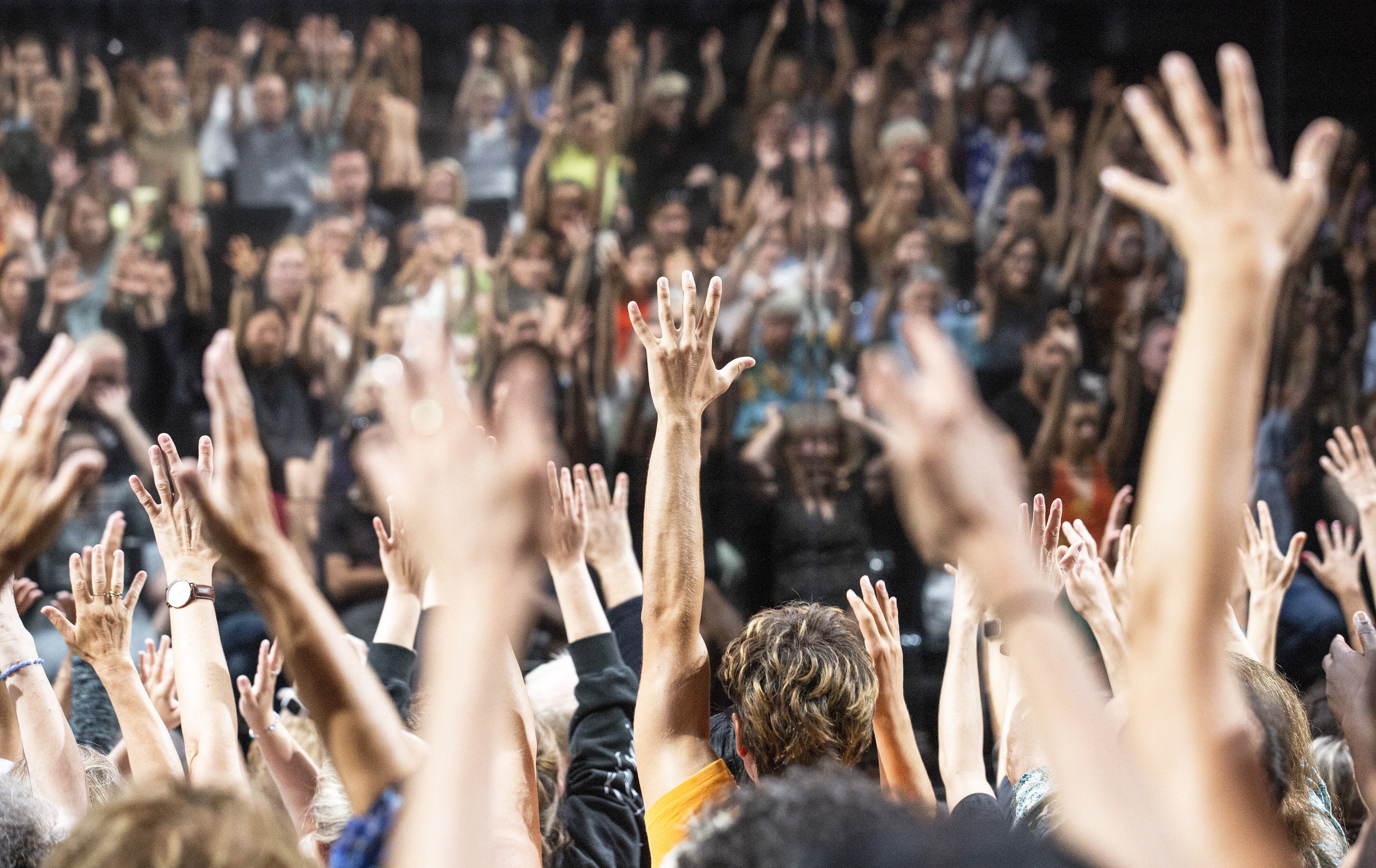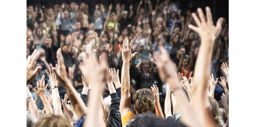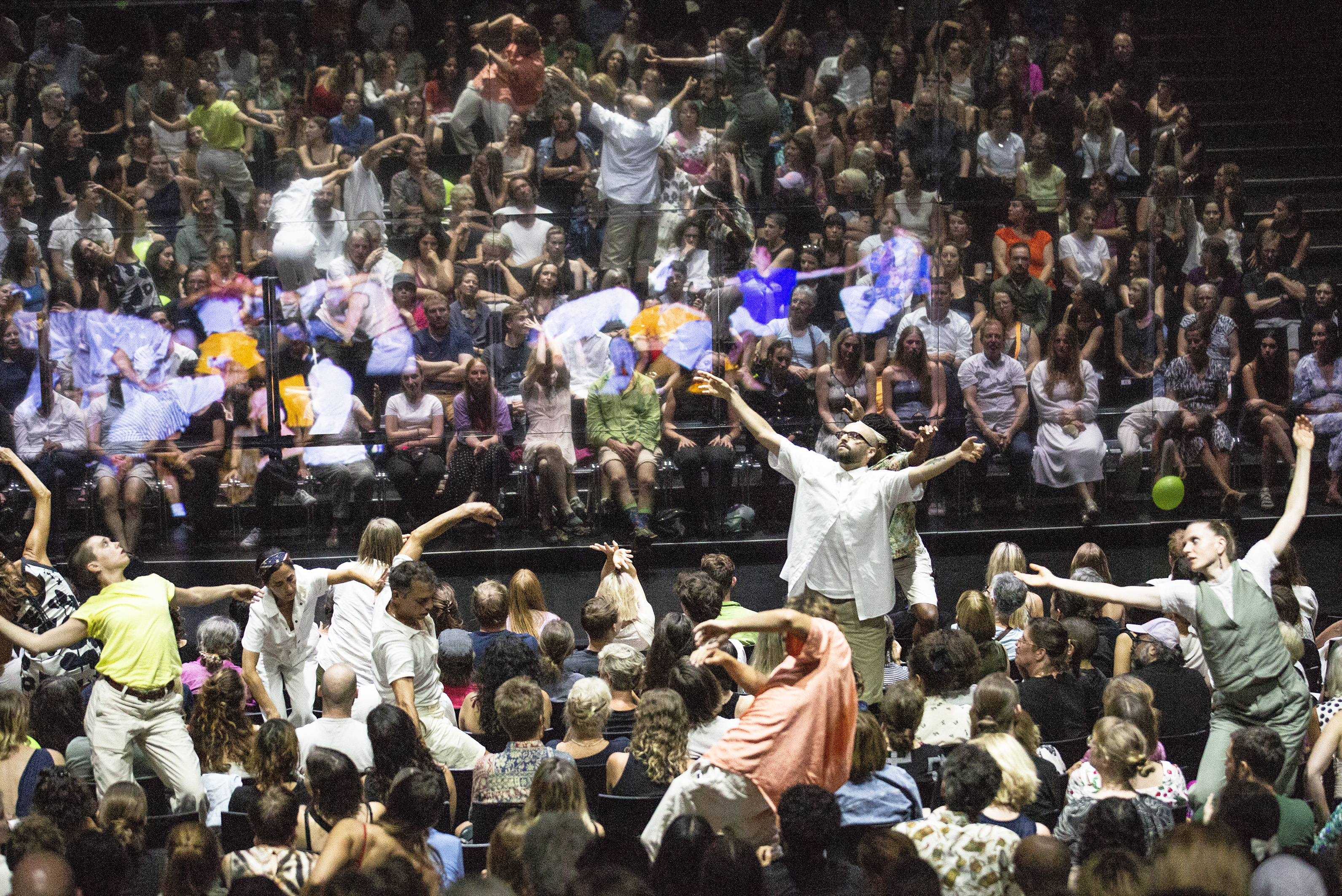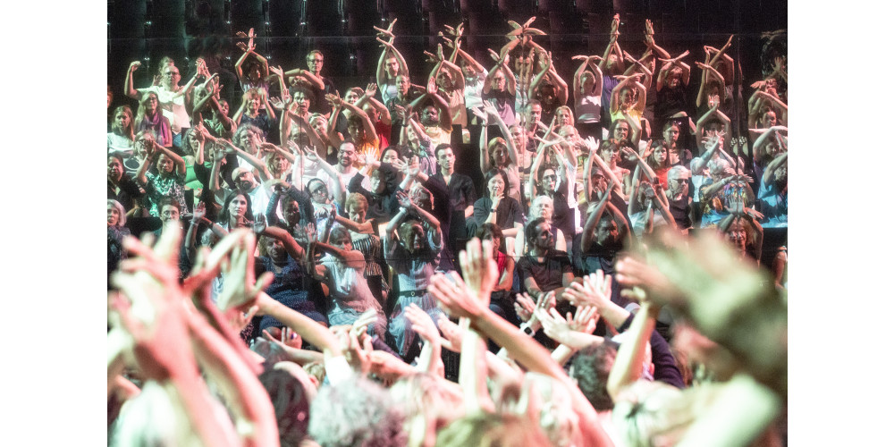 Angeheizt wird das Verhalten der Menge durch die im Publikum verteilt sitzenden, aber als solche nicht erkennbaren Tänzer*innen. Sie geben immer wieder Impulse, ohne dass dies als solches wirklich klar ist. Das wirkt animierend, und es kommt sogar so etwas wie eine „La Ola“ zustande, die man aus den Fußballstadien kennt. Mit der Zeit wird die Menge mutiger. Was, so fragt eine Stimme aus dem Off, würde wohl passieren, wenn das Miteinander noch etwas intensiver würde, zum Beispiel, indem man sich an der Schulter berührt? Wo beginnt, wo endet der Bereich, der nur zu einem selbst gehört? Wo kann und will ich mich mit den anderen verbinden? Und wieder entstehen erstaunliche Bewegungsmuster – man reicht sich die Hände, auch über die Reihen hinweg, man lehnt den Kopf an die Schulter des Nachbarn, und irgendwann tanzt das ganze Publikum, zumal, wenn die Musik (zusammengestellt von Tobias Koch) Club-Atmosphäre verbreitet.