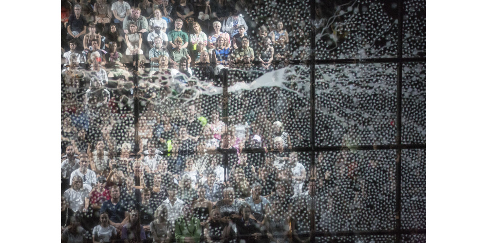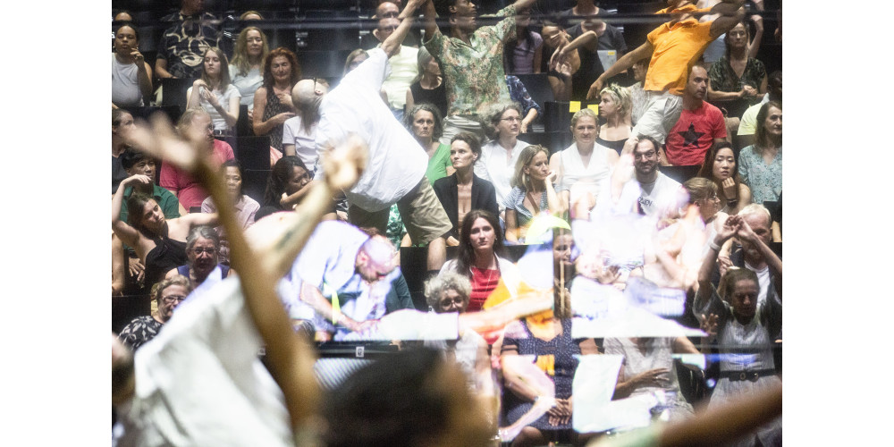 Und so steigert es sich zum Schluss hin, wenn sich die sieben Tänzer*innen aus der Menge lösen und sich in diversen Verrenkungen über die Reihen hinweg nach oben bewegen. Bis auf der Spiegelwand Projektionen erscheinen, die klar machen, dass alles im Fluss ist, dass wir nie nur wir selbst sind, sondern immer in Beziehung zu anderen stehen. Das mag eine Binsenweisheit sein, aber sie kann uns gar nicht oft genug in Erinnerung gerufen werden. Schon gleich, wenn es mit einer so spielerischen, unterhaltsamen Selbstbespiegelung geschieht wie in diesem Stück.