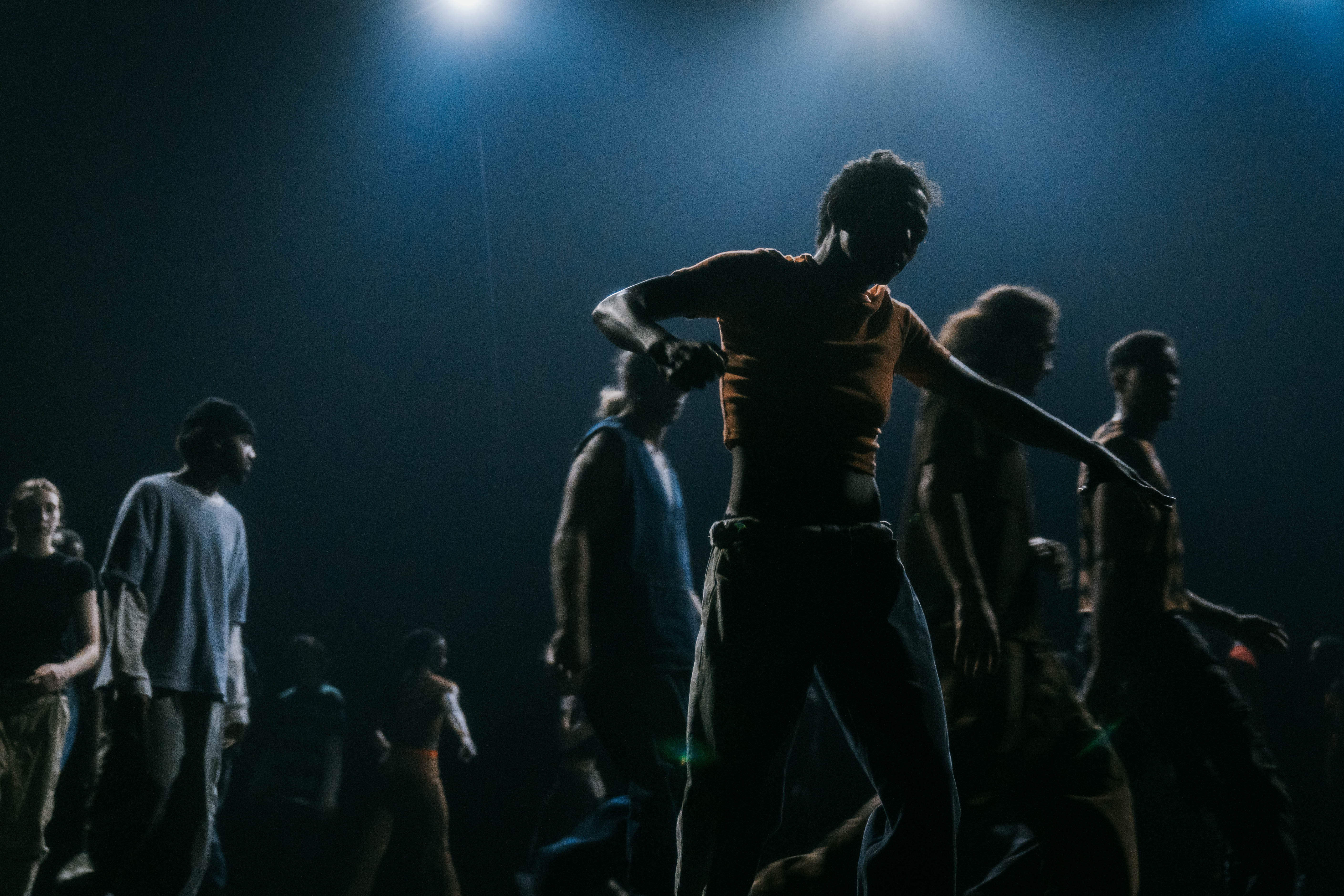 Dissonante, fast kreischende Klänge (Komposition: Mackenzy Bergile) strömen aus den Lautsprechern, wenn sich der Vorhang öffnet. Eine Gruppe von 20 Tänzer*innen steht oder sitzt in Straßenkleidung (Kostüme: Lydie Tarragon) auf der nur sparsam beleuchteten, nebelverschleierten Bühne (Lichtdesign: Tom Visser), den Blick nach rechts gerichtet. Einer löst sich und beginnt sich zu bewegen – mit schlangenartigen Armen und weichen, nachgiebigen Beinen umkurvt er die Gruppe, die ihn jedoch weitgehend ignoriert. Langsam nur rücken einzelne vor, erheben sich vom Boden und beginnen ebenfalls,