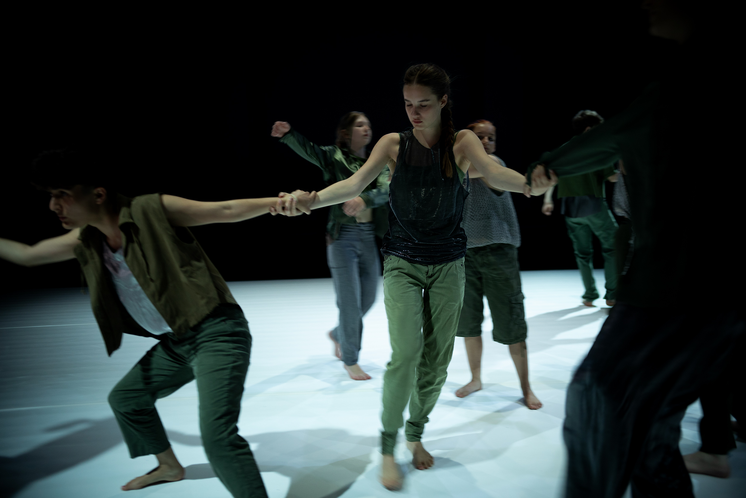 Sie verlieren den Verstand, können nicht länger aufrecht bleiben, versuchen, einander zu halten: Die Junior Company Bonn erkundet die vielschichtigen Dimensionen von Erschöpfung. Sie stehen in weißem, kühlem Licht. Wankend, kippend, jede*r für sich allein, der Blick geht geradeaus in verschiedene Richtungen. Nur eine Person geht schnellen Schrittes von einer zur anderen und hält die, die zu fallen drohen. Spannung liegt in der Luft: Gehen die Körper gleich zu Boden? Wie lange kann eine Person allein so viele auf den Beinen halten? Und dann
