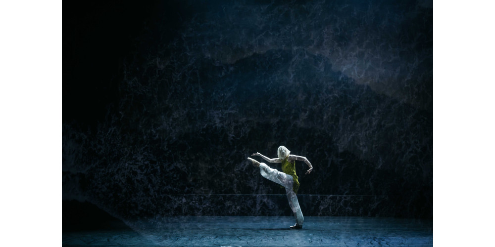 Ans Ufer rauschende, große Wellen, von oben gefilmt und auf einen Gazevorhang projiziert. Immer wieder. Dahinter eine von Sara Scarella verkörperte Figur, deren Gesicht mit einem hellen Schleier verdeckt ist und zu einem energetisch fein gestimmten Solo voll offener Bewegungen in den Raum ansetzt. Alles im Inneren bündelt sich in dieser Szene. Hoffnung, aber auch Härte, Verzweiflung, aber auch Unabhängigkeit. Ungewissheit. Als das Rauschen verebbt und sich ein surrealer Raum zeigt, bestehend aus dunklen hohen Wänden wie in einem Palast, jedoch merkwürdigerweise bestückt mit großen herabhängenden, wie kalt leuchtenden Lampen, erweitert sich das Spektrum an Zuständen und Emotionen, das sich innerlich aufgebaut hatte. Dann tritt das Ensemble en masse auf. Schlicht schwarz gekleidet tanzt es einen stummen Schrei – wie so oft bei Markowitz. Unter manchen Ärmeln ragen blutrote Hände hervor. Es geht um Gewalt, Tod und Schuld, um ein unabwendbares Geschehen.