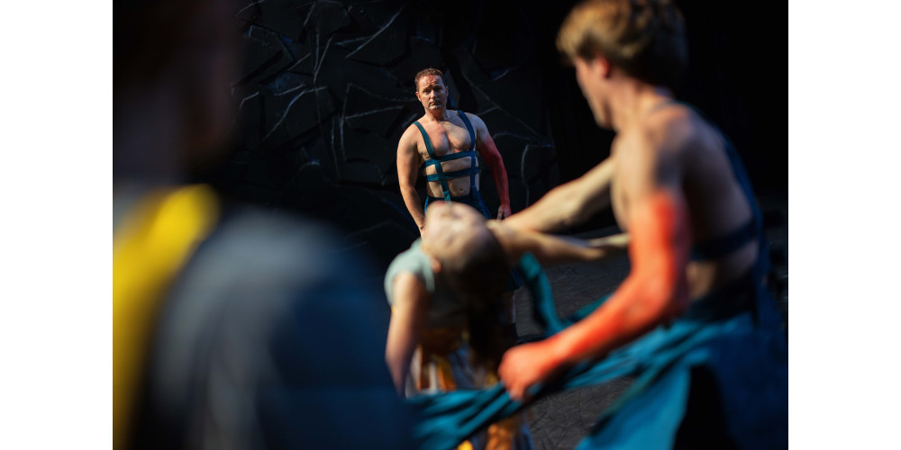 Das Potenzial, das die Inszenierung in dieser Phase noch hat, das Musikdrama „Tristan und Isolde“ von Richard Wagner aus dem Jahr 1865 als eher abstraktes Tanzstück und damit Tanzbild mit vielfältigen Bezügen zur Gegenwart herauszubringen, wird jedoch im Folgenden leider nicht genutzt. Und das liegt interessanterweise an der Kostümierung der beiden Sänger, die bei dieser Pforzheimer Premiere stimmlich und im Zusammenspiel eine hervorragende Leistung bieten: Tenor Dirk Konnerth und die dramatische Sopranistin Dorothée Böhnisch. Wo man Konnerth in seinem blauen Rock mit Streifen über dem nackten Oberkörper mit einem gut gebauten Römer aus „Asterix und Obelix“ assoziiert, wirkt Böhnisch mit ihrem langen, roten Perückenzopf und dem langen Gewand wie eine Mischung aus Majestix und Gutemine.