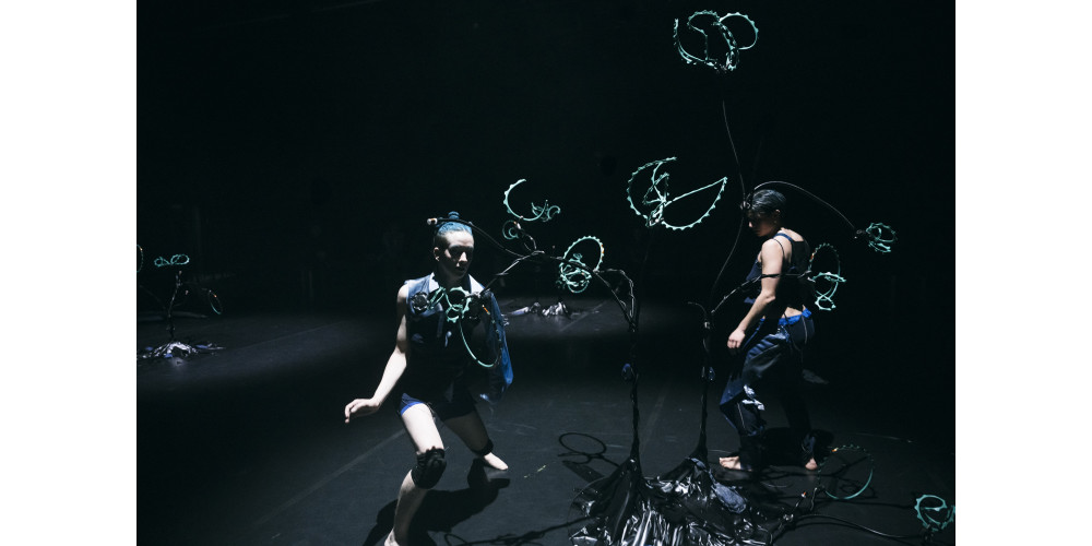 Laura Boser und Lina Hartmann verkörpern in der Nürnberger Tafelhalle diese Wesen. Die beiden Tänzerinnen tragen blau-schwarze Kostüme. Eine Mischung aus Sportbekleidung, Latexgeschirr und Stofffetzen, entworfen von Simone Körner und Amelie Schlemmer. Zudem prangen bei Boser an den Schulterblättern zwei große Magneten. Hartmann hingegen trägt ihre vorne an den Schultern. Als wäre all dies nicht schon wundersam genug, kauern sie zwischen pflanzenähnlichen Gebilden aus Draht, Kabeln und Metallspulen. Die Flora hat hier eindeutig ein technoides Gepräge. Drei dieser merkwürdigen Pflanzen stehen in großem Abstand zueinander auf der kreisrunden Spielfläche. Drumherum: das Publikum.