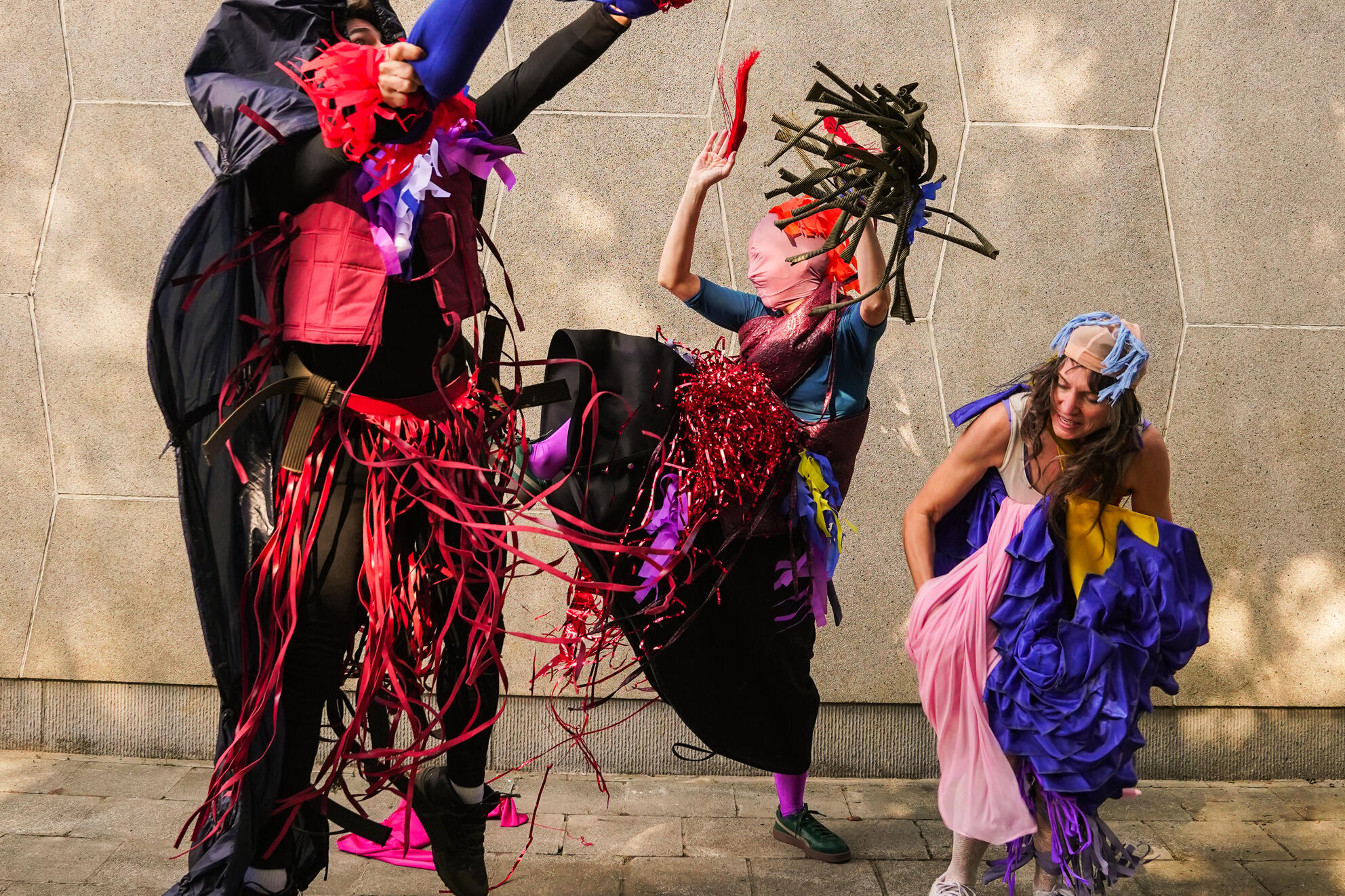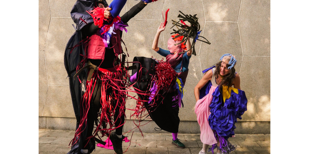 Spielerisch neugierig setzen sich die drei Performer*innen zu den Kindern. Die Energie im Raum ist nicht zu ignorieren; der Spaß kann beginnen. Rhythmische Sounds aus dem Off geben eine Grundstruktur vor für eine scheinbar nicht zu stoppende Bewegungsfreude. Nach und nach greifen sich die drei einzelne Kostümteile, die ganz wunderbar phantasievoll amorph irgendwas sein könnten und deshalb nach Lust und Laune irgendwie genutzt werden können. Vielleicht ist es ein Ärmel oder ein Hut oder ein Rock.