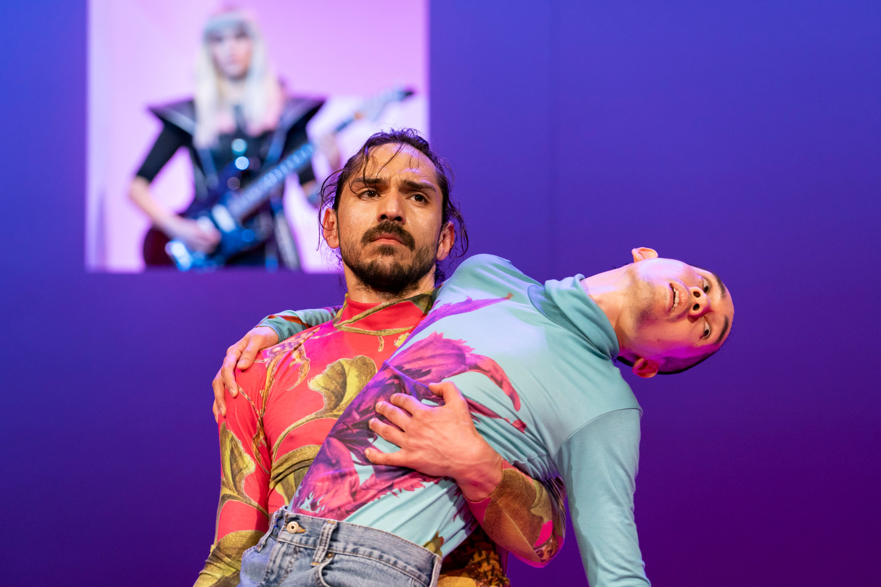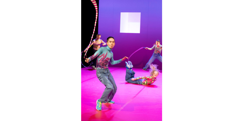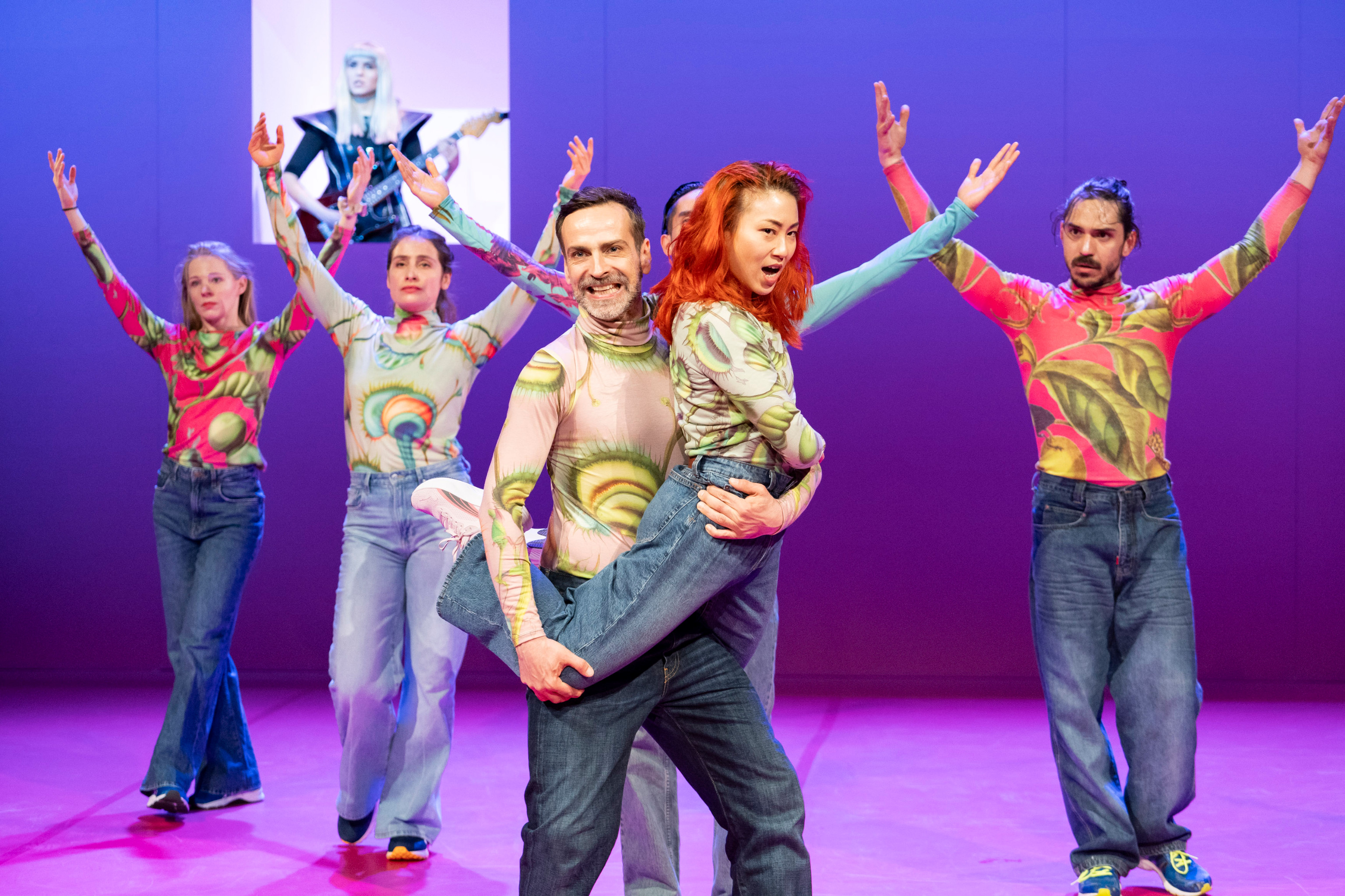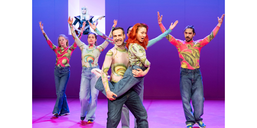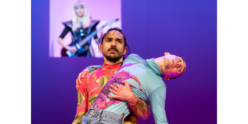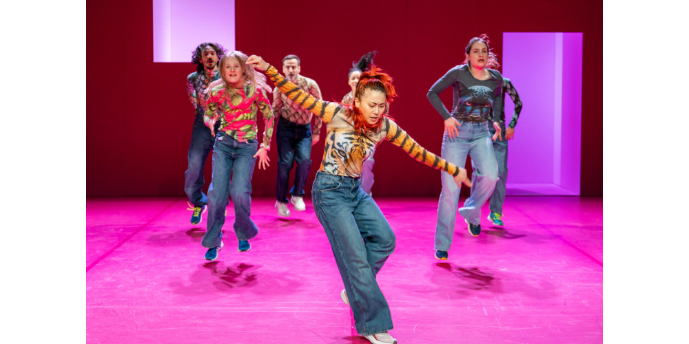 Die schlichte Bühne ist in Pink gehalten (Ronni Shendar), hat ein Fenster und eine Tür, die manchmal andersfarbig beleuchtet sind. Dazu kommen zurückhaltende Videos, die öfter zum Lachen reizen. Der Sound (Simon Bauer) ist von sich wiederholenden Gitarrenparts und wabernden Soundteppichen geprägt. Spannend wird es bei den gesprochenen Anteilen aus den Lautsprechern. Zitate aus den sozialen Medien werden wie Liedtexte aneinandergefügt, die von den Akteuren mimisch oder tänzerisch vorgetragen werden. Was manchmal verblüffend gut passt, manchmal eher die Brechung thematisiert (Frau zu Männerstimme und umgekehrt). Dabei haben die sehr unterschiedlichen Tänzer*innen fulminante Solos, etwa Maja Mirek und Jeff Pham.