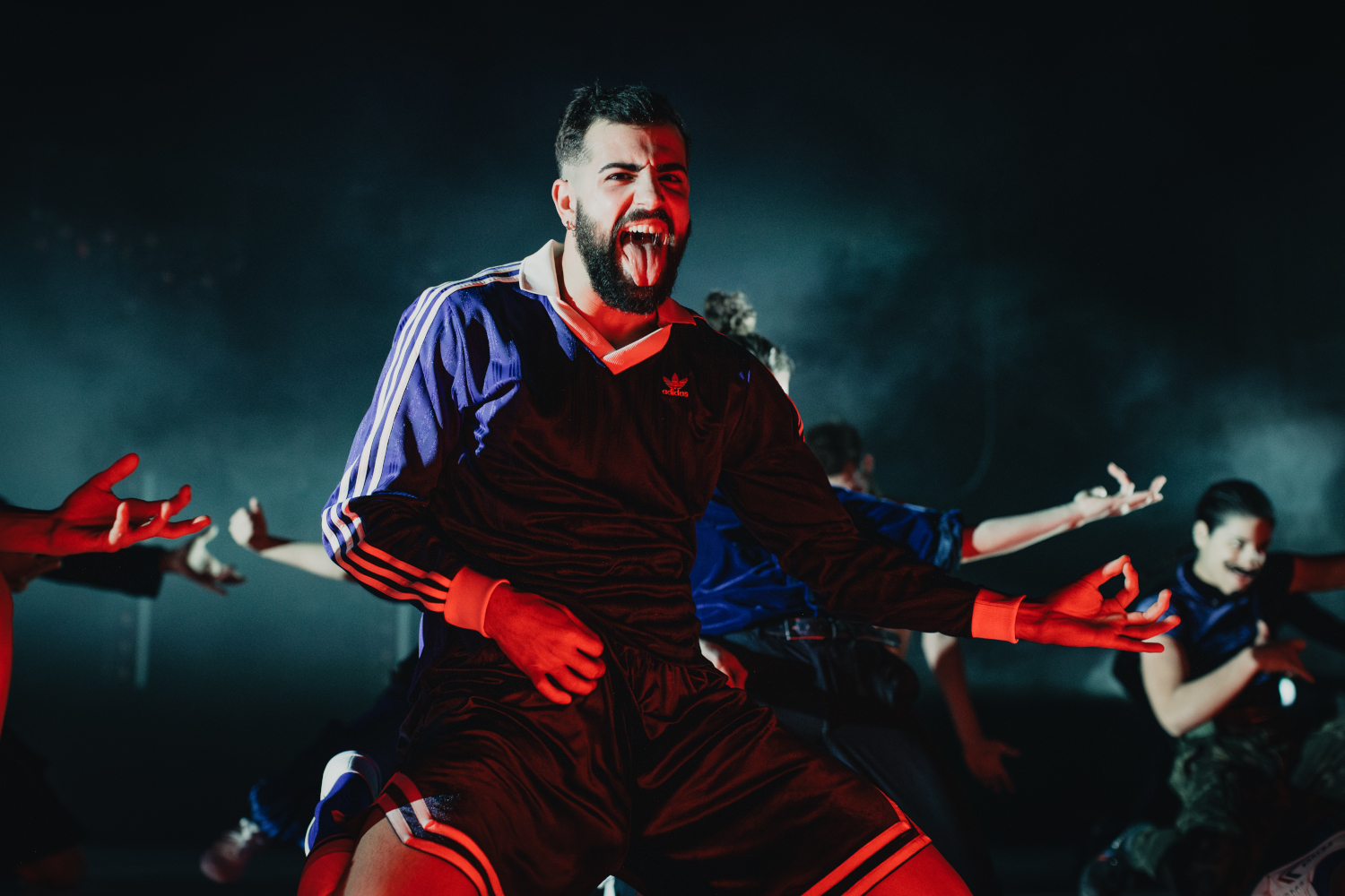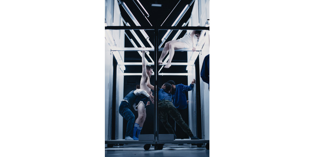 Mit dem, was Andrea Costanzo Martini gemeinsam mit der Tanzcompany des Musiktheater im Revier auf die Bühne des Kleinen Hauses gebracht hat, drehen alle gemeinsam diesen Fiesling aber selbst durch den Fleischwolf, zumindest im übertragenen Sinn. Testosterongeschwängert ist die Luft ganz zu Anfang: Ein herrlicher Vertreter des vermeintlich starken Geschlechts nach dem nächsten nimmt die Bühne für sich in Anspruch. Maskuline Gesten und Posen en masse. Selbst die Kostüme schwelgen in diesen „Männlichkeiten“: knappe Sportshorts zu freiem, natürlich muskulös-definiertem Oberkörper, Anzug und Krawatte, enge Jeans oder Kilt und ein bisschen Camouflage. Geht alles. Genauso wie der gute, alte Griff in den Schritt und artverwandtes Imponiergehabe.