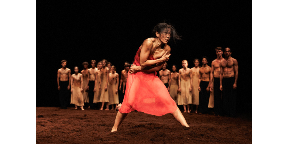 Die Intensität, die das Ensemble hier vor allem in den geschlossenen Gruppenszenen schafft, ist schlichtweg beeindruckend. Das hat, trotz der ausufernden Emotionalität, fast schon formalistische Strenge, wie alle in einem gemeinsamen Atemzug beben. Tsai-Chin Yu als das Opfer im berühmten roten Kleid wächst geradezu über sich hinaus, selbstvergessen, die Selbstaufgabe scheinbar umarmend. Es war nicht zu übersehen, wie sie hustend in der Mitte ihrer Kolleg*innen die Begeisterung des Publikums im ersten Moment gar nicht annehmen konnte. Und man fragt sich: Was wäre dieses Stück ohne die lose Erde auf dem Boden, die den (inneren) Kampf erst so richtig sichtbar macht? Unvorstellbar.