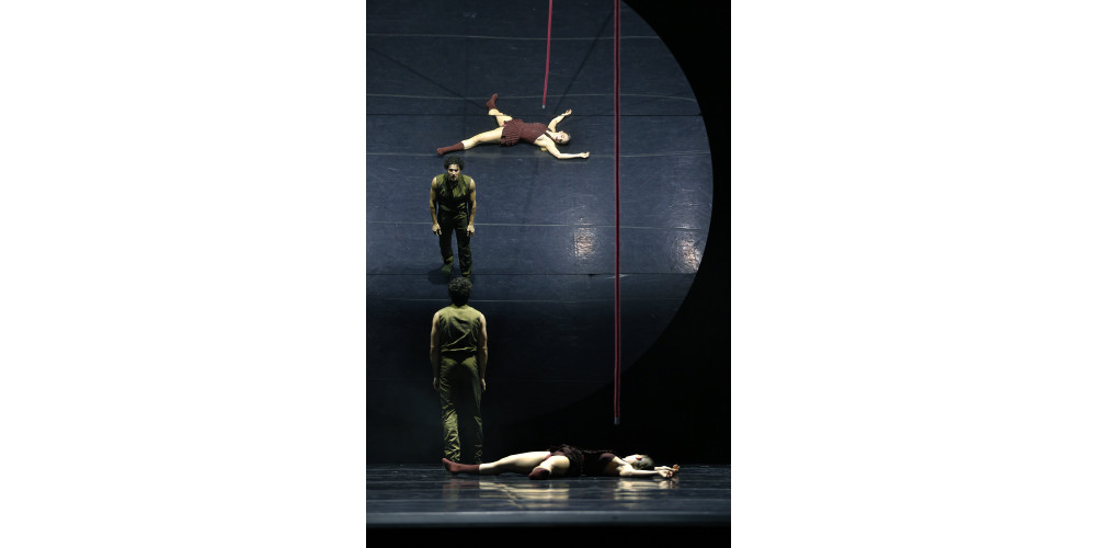 Femizid, das ist das Thema, und Mannes erzählt es mit seinem Ensemble schnörkellos und bildgewaltig. Schon zum Start ist alles klar: Am Boden liegt Carmen (Chiara Amato), auf der Bühne steht alleine der Mörder Don José (Marco Marangio), ein riesiger runder Spiegel ruht im Hintergrund, und ein einzelnes, rotes Seil ragt aus dem Schnürboden herab. Rot und schwarz sind die dominierenden Farben des Abend, und von einer wie auch immer gearteten Flamenco-Leichtigkeit wird hier nichts zu sehen sein.