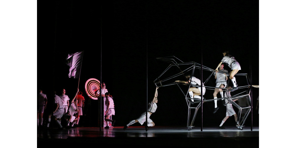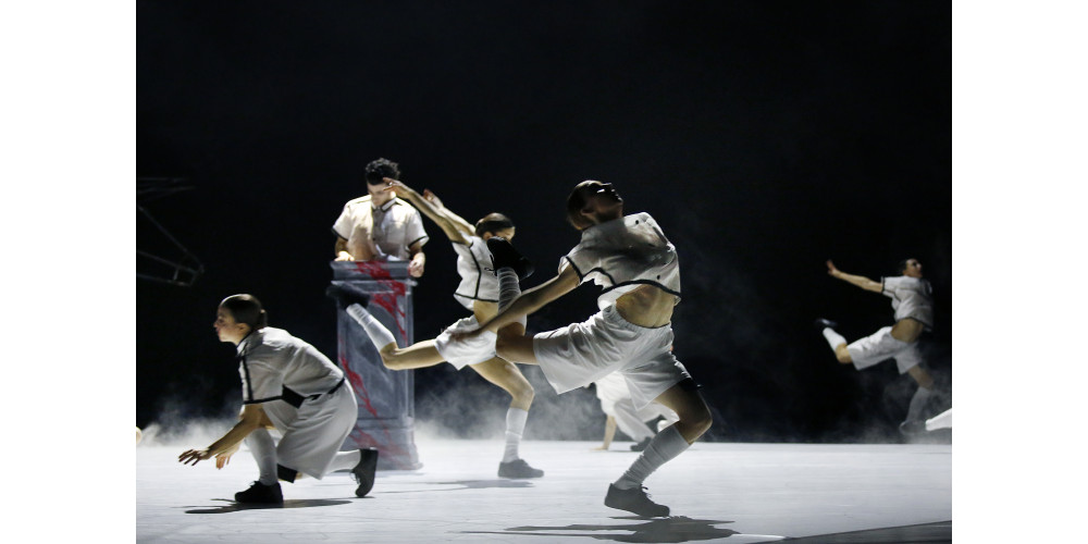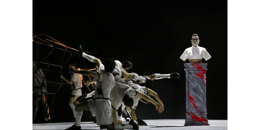 So fahren etwa vier Gitterstäbe herunter (auch ein Zitat an die „Carmen“ zuvor?), schaffen Distanz, erzählen aber wenig. Auch die Blendungsszene, wenn dem Tänzer die Augen verbunden werden, führt im Grunde zu keiner Eskalation, sondern ist nur ein Element mehr in diesem wabernden Bedeutungsüberschuss, der auf der Bühne ziellos vor sich hin mäandriert. Selbst starke Bilder wie die Eroberung des Stiers durch den Künstler fallen da kaum noch auf, auch weil ein Spannungsfeld zwischen Künstler und Stier nicht konsequent etabliert wurde.