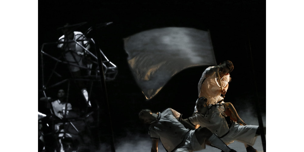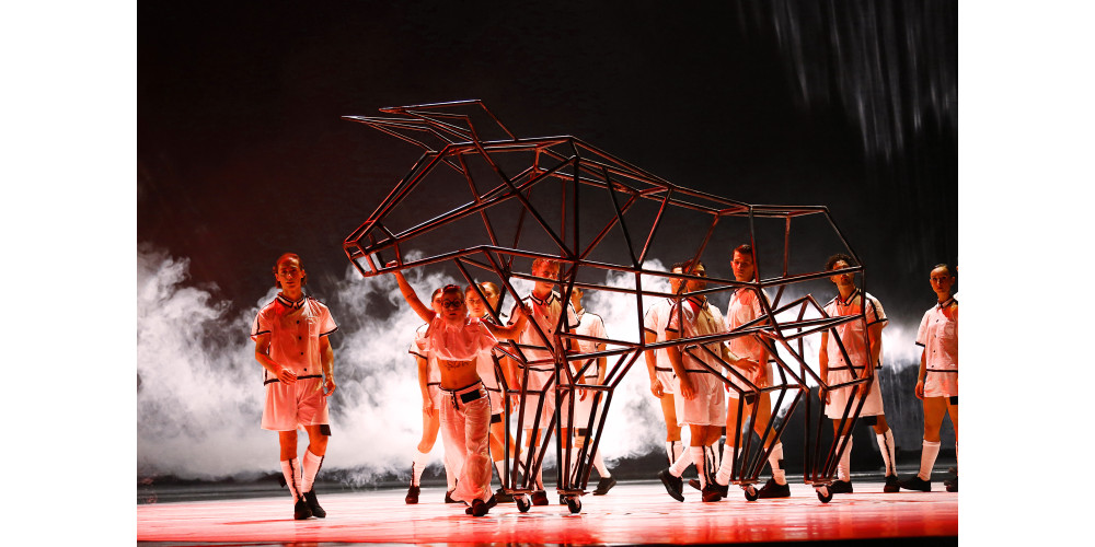 Wichtigstes Requisit aber ist ein großes Stahlgerüst in Form eines Stiers, in das die Tänzer*innen klettern können und das von ihnen bewegt wird. Alle huldigen der Statue, die schließlich zum Leben erweckt und so einen ersten fulminanten Aha-Moment bildet, zumal gleich darauf Fiametta Gotta mit der Maske eines alten Mannes auf die Bühne stürzt und nun das Heft in die Hand nimmt, die Gruppen dirigiert, mal hochgehoben, mal verschmäht wird, aber eben der Künstler ist, um den es hier offenbar geht. So lehrt sie vom Rest der gestürzten Statuen eine Choreografie, die am Ende – nach dem potenziellen Tod des Künstlers – wieder aufgegriffen wird. Ein Tänzer wird mit einem roten Tuch blind gemacht. Der Tier fährt hin und her, und eine Fahne, die zunächst als Schwanz dient, wird immer wieder hin und her gewedelt, als wäre man bei einem Stück von Moritz Ostruschnjak. Doch nach einem bildstarken Start zerfasert die Choreografie mehr und mehr. Es fehlt an einem dramaturgischen Rhythmus, an den wirklich klar gesetzten Punkten in dieser ja bewusst assoziativ gebauten Arbeit.
