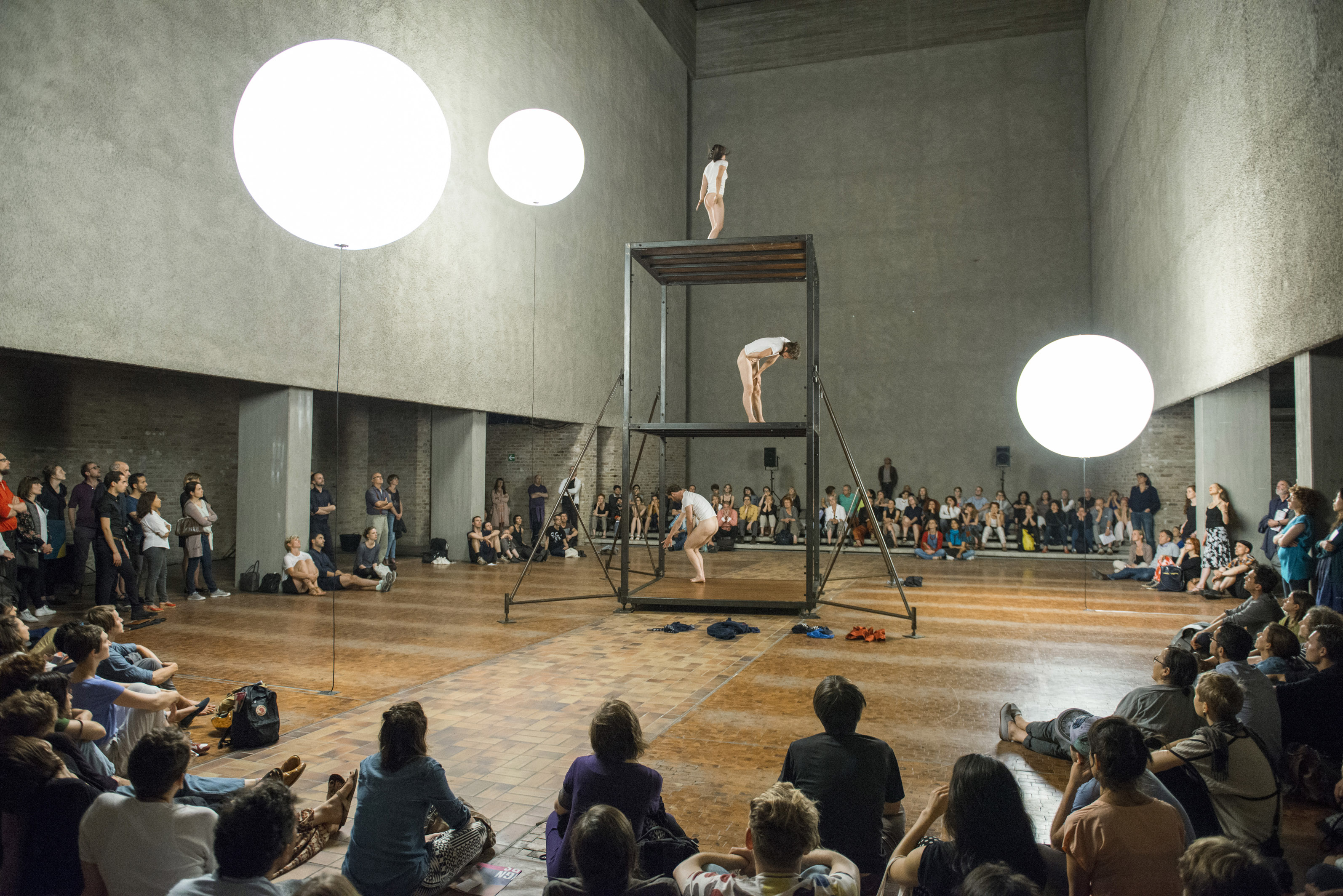 Auf einem dreistöckigen Gerüst tanzen eine Frau und zwei Männer. Alle drei sind nur mit einem weißen T-Shirt bekleidet. Sie stehen übereinander und somit in keinem Bezug zueinander. Die Choreografie erinnert mehr an Bewegungsstudien und wirkt teilweise improvisiert. Das knapp 40-minütige „Aatt enen tionon“, 1996 kreiert, kann allerdings als eine Referenz an unsere Gesellschaft, in der eher nebeneinander als miteinander gelebt wird, gesehen werden.