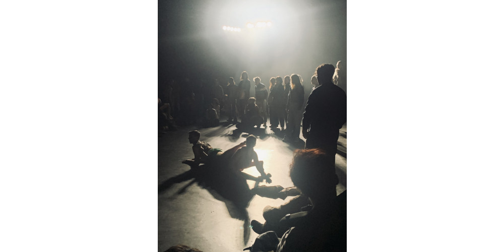 Der Raum bleibt ohne zentralen Fokus und in ständigem Wandel. Bis ein einzelner Spot dann doch die Aufmerksamkeit und damit auch die Bewegungen der Zuschauer*innen auf einen Punkt ausrichtet. So lässig wie das Publikum ist auch die Performance. In slow motion improvisieren sich die Tänzer*innen um die Anwesenden herum, die in ihrer Reaktion teilweise in der Bewegung verharren. Bloß nichts falsch machen! So einfach ist das mit der Eroberung des Raumes dann also doch nicht ganz. Und es ist in solchen Arbeiten immer wieder ergötzlich, das Publikum beim Beobachten zu beobachten.
