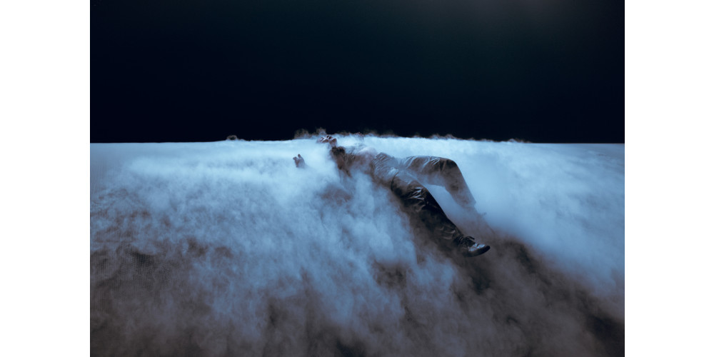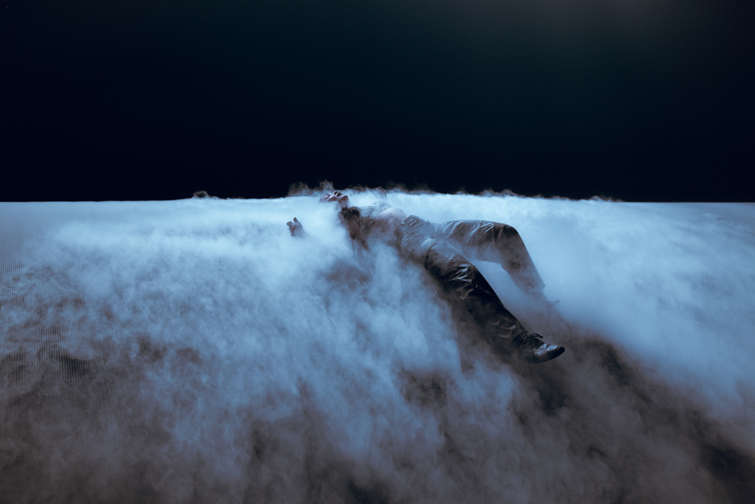 Es ist stockdunkel in der K6 auf Kampnagel, als tief im Hintergrund der Bühne ein diffus orangefarbenes Licht zu leuchten beginnt und zu impulshaften elektronischen Klängen (Musik: Thomas Bangalter) schemenhaft eine dunkle Gestalt aus dem Nichts aufsteigt. Langsam schreitet sie auf halber Höhe der Bühne entlang, fast könnte man meinen, sie schwebe, bis das Licht etwas heller wird und preisgibt, dass die Bühne einer sich nach hinten erhebenden und brechenden Welle gleicht, die nach vorn als schiefe Ebene abfällt. Wie in der Morgendämmerung wird es langsam etwas heller, weitere Gestalten kommen hinzu und bewegen sich langsam tastend, wie in Zeitlupe, zu den Impulsklängen über die schiefe Ebene nach vorne.