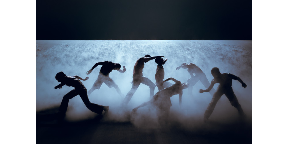 Nur eine Gestalt kämpft sich durch den wabernden Schwall nach oben, wo sie sich langsam ins Nichts auflöst, während auf dem Wellenkamm jetzt eine andere Gestalt schemenhaft in einem schimmernden Lichtnebel erscheint. Verteilt über die Bühnenbreite leuchten fünf weitere Gestalten auf, keine davon ist wirklich, es sind Projektionen, Zeichen aus fernen Welten, die wiederum im Nichts verschwinden.